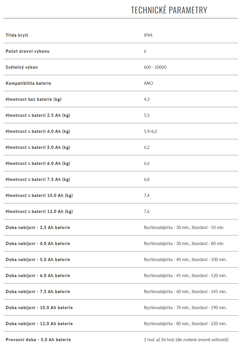 A doba svícení? S 5Ah baterií EGO je doba svícení na nejnižší intenzitu až 36 hodin, na nejvyšší úroveň svícení nám baterie 5Ah vydrží cca 3 hodiny. To docela ujde, ne?