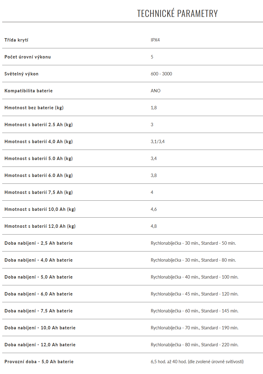A doba svícení? S 5Ah baterií EGO je doba svícení na nejnižší intenzitu až 40 hodin, na nejvyšší úroveň svícení nám baterie 5Ah vydrží cca 6,5 hodiny. To docela ujde, ne?