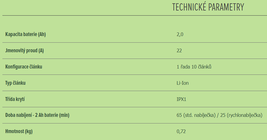 | Doba nabíjení - 2 Ah baterie (min): | 65 (std. nabíječka) / 25 (rychlonabíječka) |