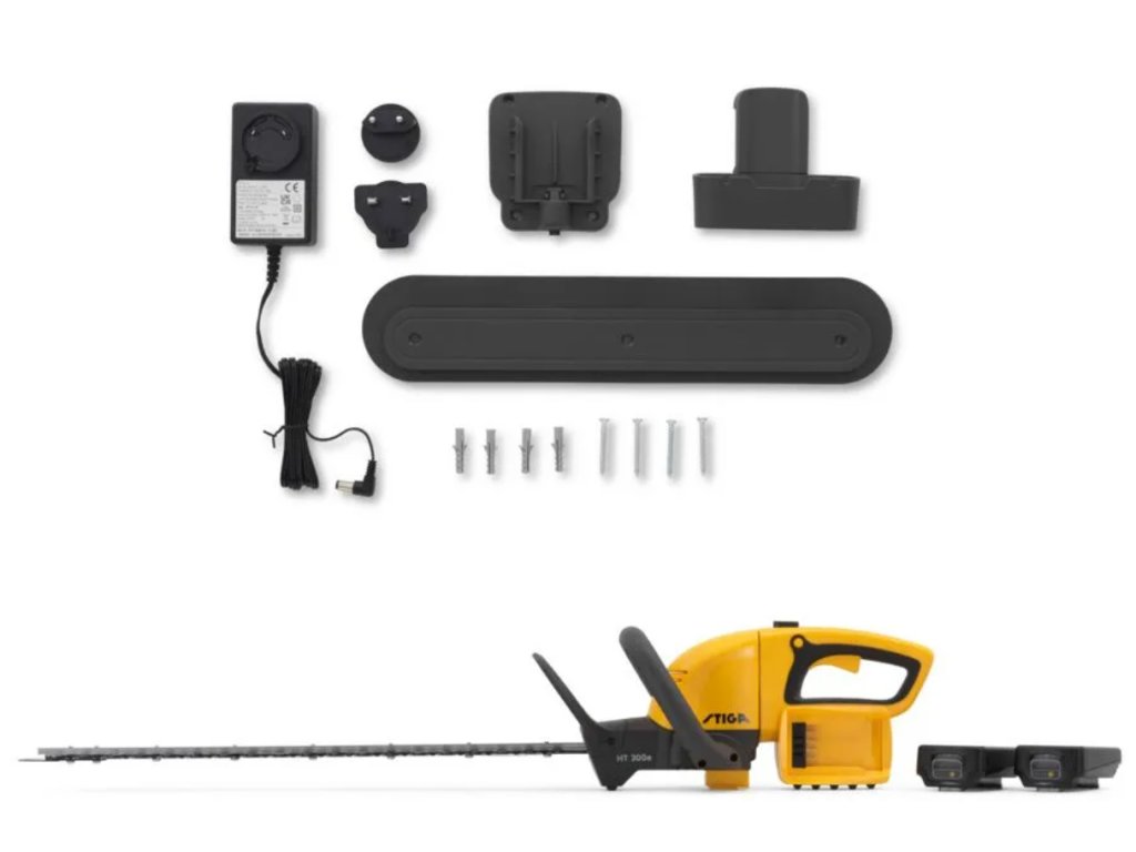 bateriový plotostřih STIGA HT 300e, 2× 20V akumulátor ePower, nabíječka, nástěnný nabíjecí a úložný systém STIGA
