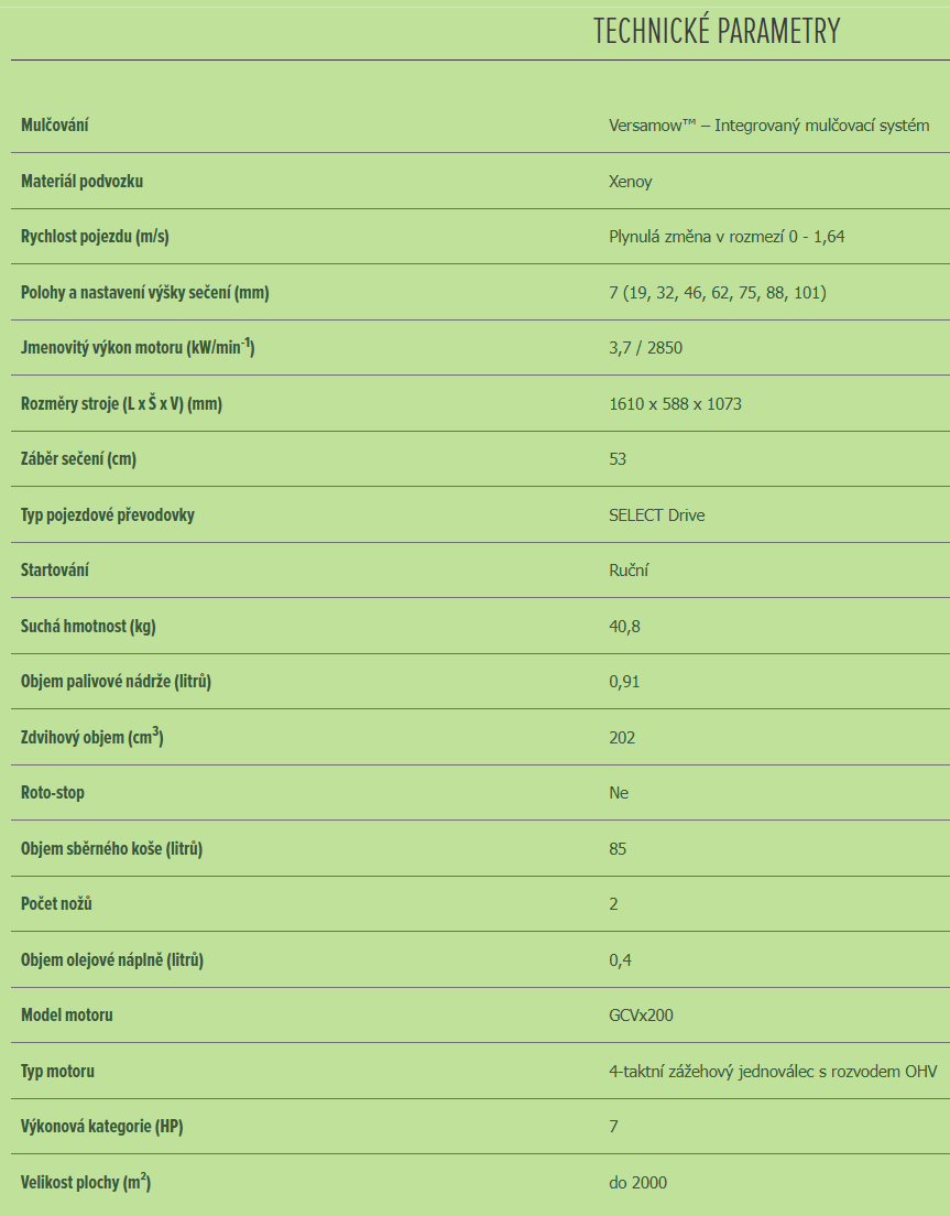 | Mulčování: | versamow™ – Integrovaný mulčovací systém |