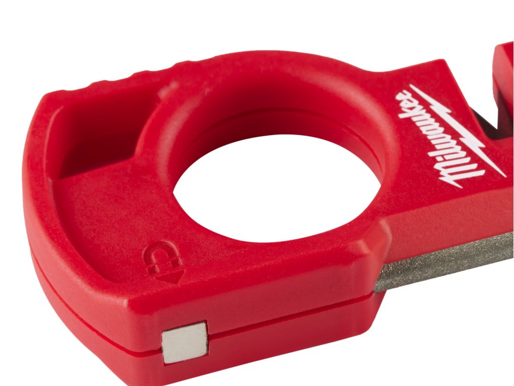 Kompaktní brousek na nože Milwaukee nabízí tři způsoby ostření pro různé typy čepelí, včetně těžších, lehčích a zoubkovaných. Díky otvoru pro prst je zajištěno snadnější držení a lepší ovládání. Pro pohodlné uložení je brousek vybaven magnetem. Vysoce kontrastní identifikační značky na přední i zadní straně zajišťují lepší čitelnost.