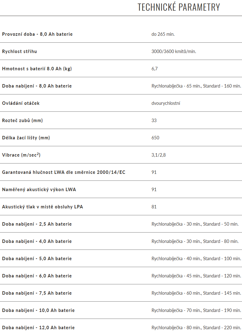 | Doba nabíjení - 8,0 Ah baterie: | Rychlonabíječka - 65 min., Standard - 160 min. |