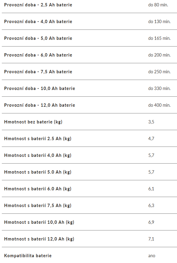 | Provozní doba - 2,5 Ah baterie: | do 80 min. |