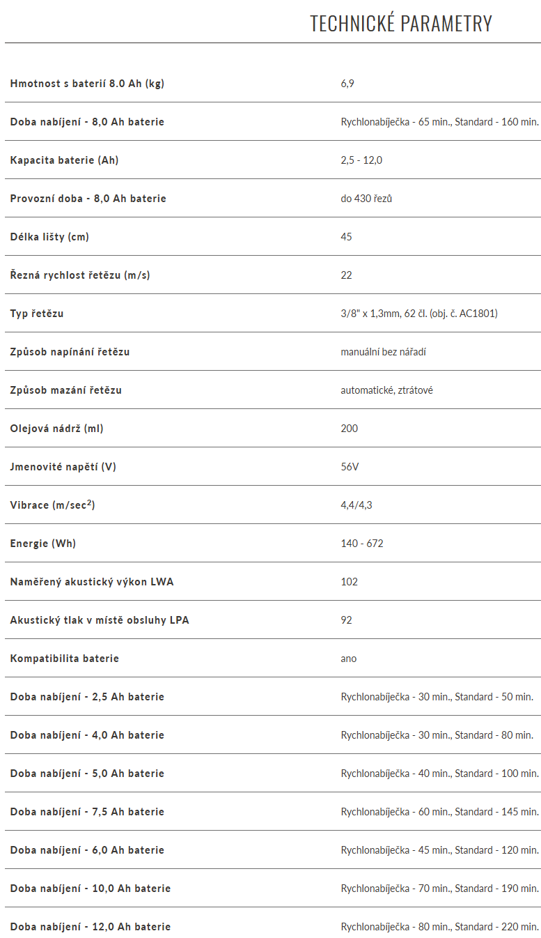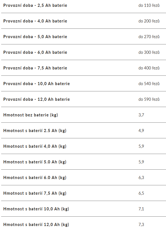 | Provozní doba - 5,0 Ah baterie : | do 270 řezů |