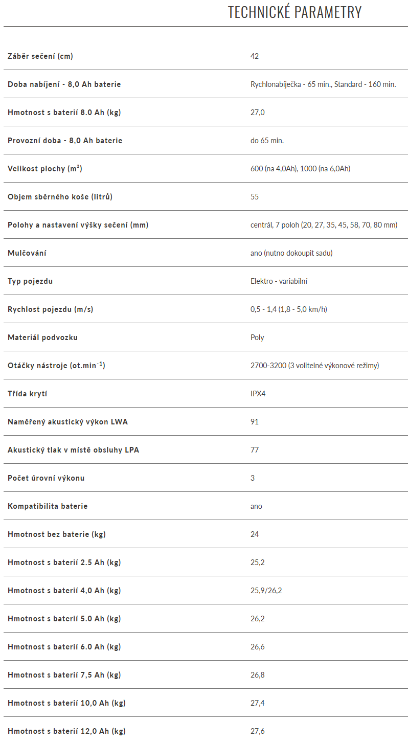 | Polohy a nastavení výšky sečení (mm): | centrál, 7 poloh (20, 27, 35, 45, 58, 70, 80 mm) |