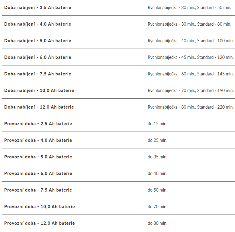 | Doba nabíjení - 7,5 Ah baterie: | Rychlonabíječka - 60 min., Standard - 145 min. |