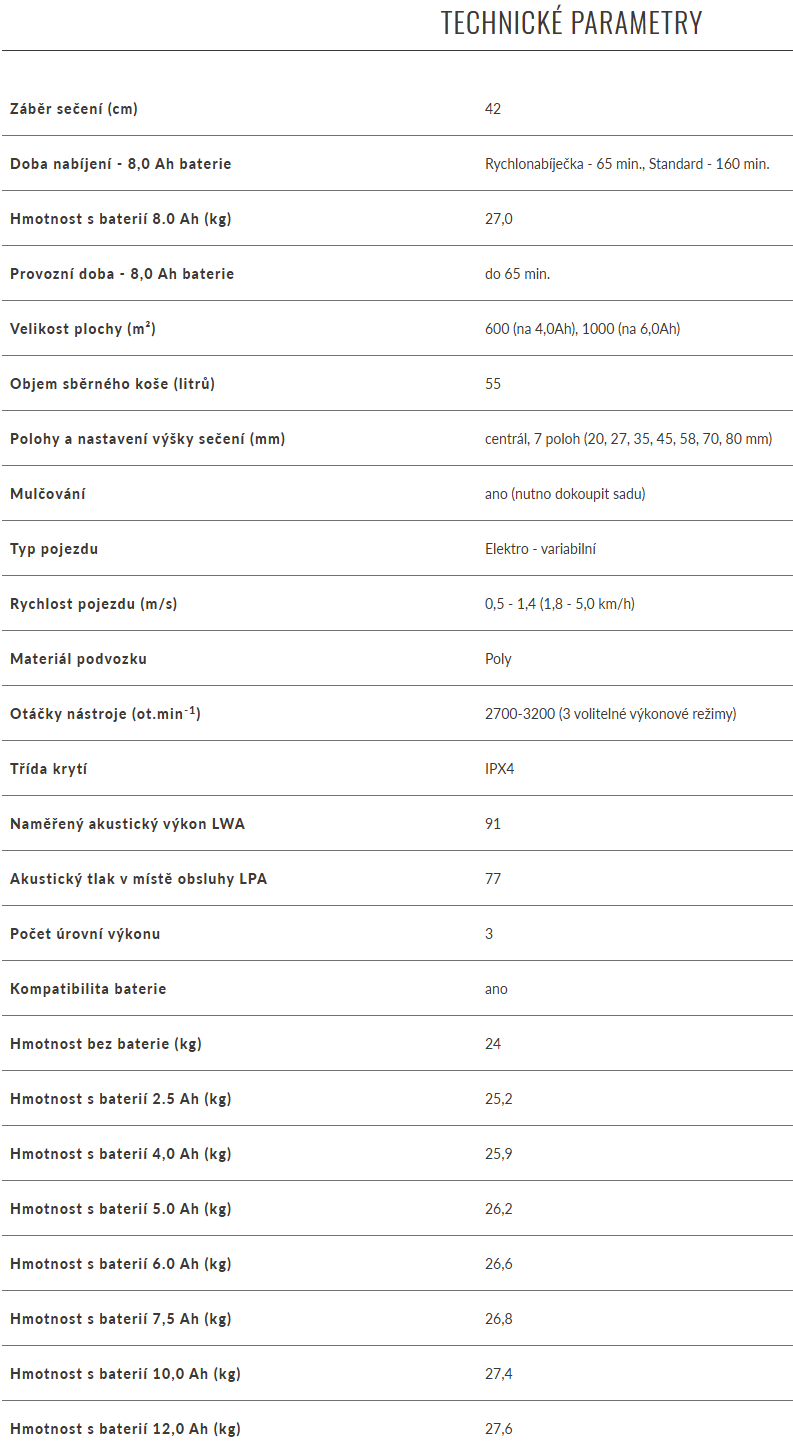 | Polohy a nastavení výšky sečení (mm): | centrál, 7 poloh (20, 27, 35, 45, 58, 70, 80 mm) |