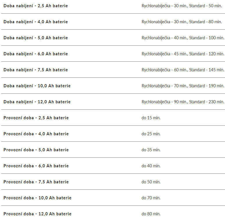 | Doba nabíjení - 7,5 Ah baterie: | Rychlonabíječka - 60 min., Standard - 145 min. |