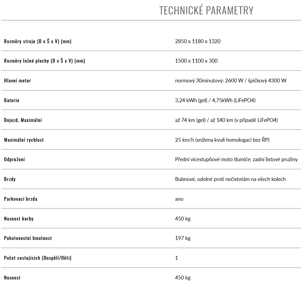 - Rozměry vozidla (D x Š x V): 2850 x 1180 x 1320 mm