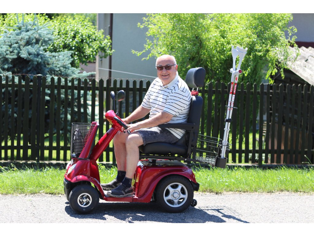 Tento invalidní elektrovozík je uzpůsoben pro potřeby osob se zhoršeným zdravotním stavem. Pomocí páček na řidítkách velmi jednoduše volíte rychlost pojezdu, dále máte možnost max. rychlost omezit kolečkem (potenciometrem). Tento model nabídne úložný prostor v nákupním koši na řidítkách a velice snadnou možnost nasedání, díky otočnému a polohovatelnému sedadlu, které tvoří pohodlnou oporu celých zad. Loketní opěrky po obou stranách pomáhají ještě vyššímu komfortu.