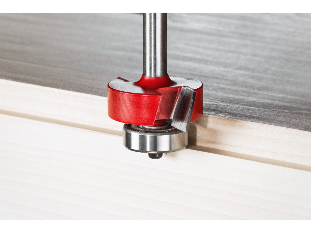 - Dvoubřitá tvrdokovová falcovací fréza se spodním ložiskem pro samonavádění, vhodná pro vytváření polodrážek na rovných i zakřivených obrobcích