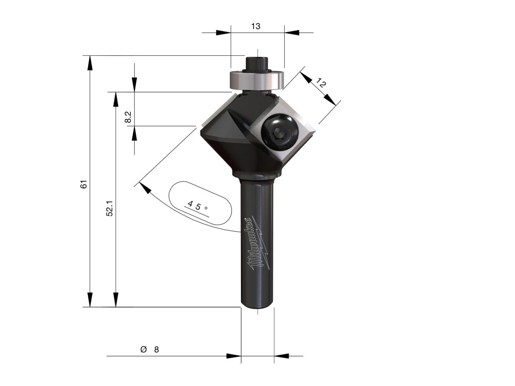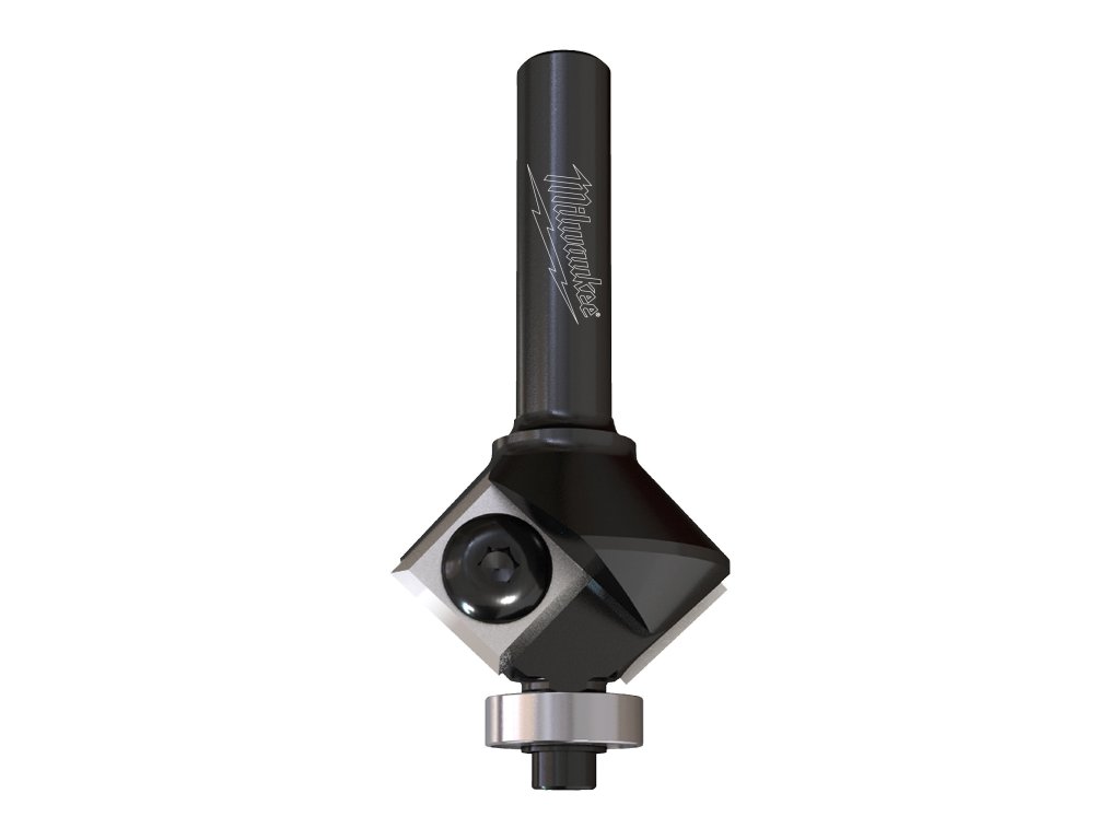- Fréza pro srážení hran se dvěma vyměnitelnými tvrdokovovými břity. Se spodním ložiskem pro samonavádění, bez nutnosti použití šablony.