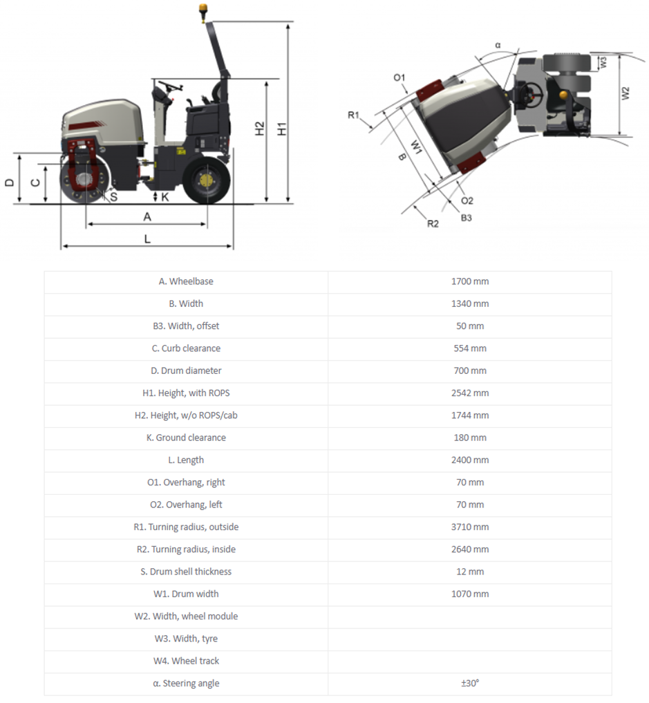 Tandemový válec Dynapac CC1100C VI je kompaktní, obratný stroj určený pro hutnění asfaltových vrstev, podkladních vrstev a opravy povrchů na městských komunikacích, chodnících či parkovištích. Díky motoru Kubota D1703-DI (T4/V) s výkonem 18,5 kW (25 hp) poskytuje spolehlivý výkon, nízkou spotřebu paliva a splňuje emisní normy Stage V. S provozní hmotností 2215 kg, hutnicí šířkou 1070 mm a statickým lineárním zatížením 10,7 kg/cm nabízí ideální kombinaci výkonu, přesnosti a stability pro lehké i střední asfaltářské práce.