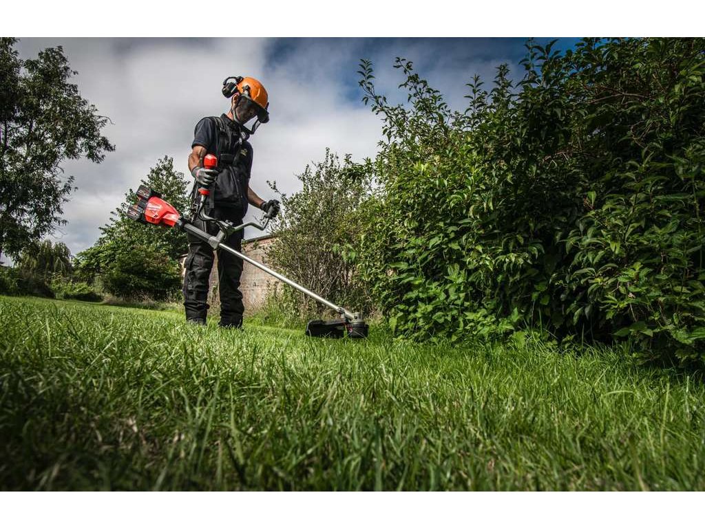Součástí balení je vyžínací hlava se záběrem 38–43 cm a odolná trojzubá lišta pro ještě náročnější aplikace. Dva nastavitelné režimy výkonu umožňují přizpůsobit stroj buď na maximální sílu, nebo na delší výdrž baterie. Rukojeť ve tvaru řídítek lze snadno upravit díky praktickému sklopnému systému, který zajišťuje ergonomické držení i při delší práci. Optimalizovaný kryt navíc účinně brání rozptylu posekaného materiálu.