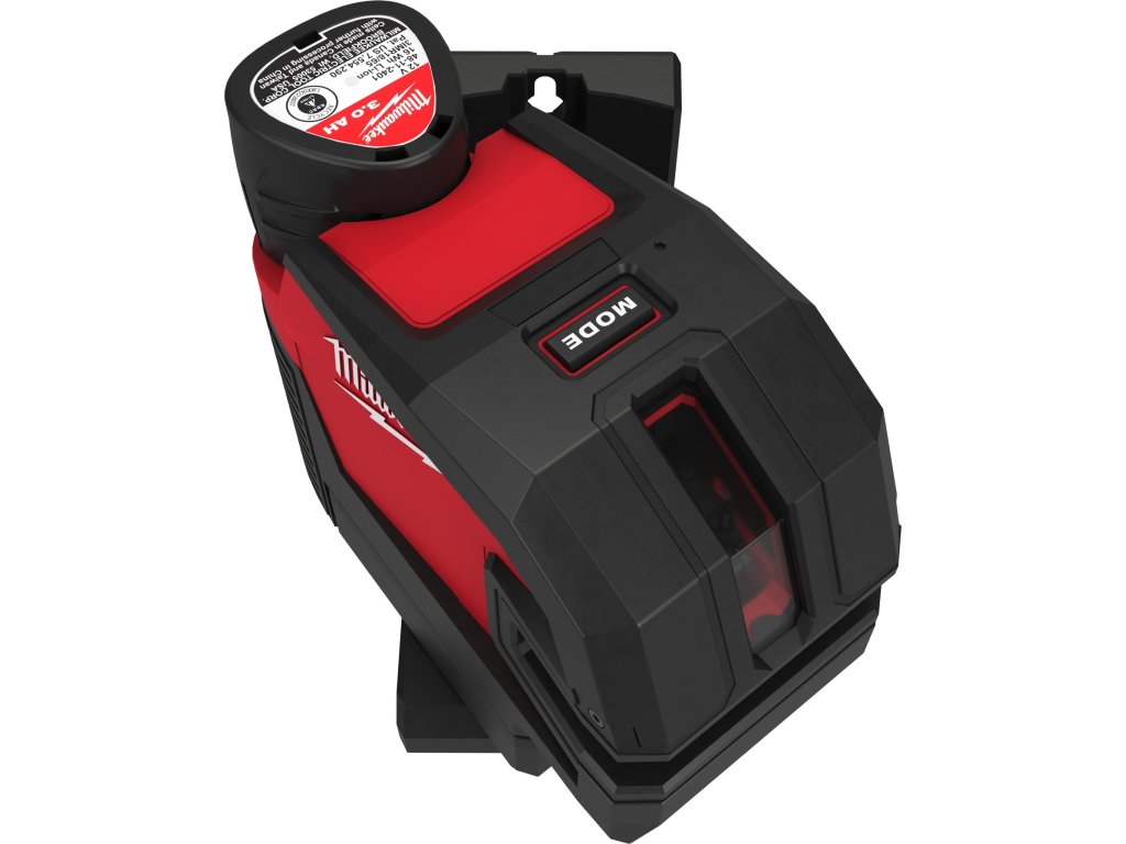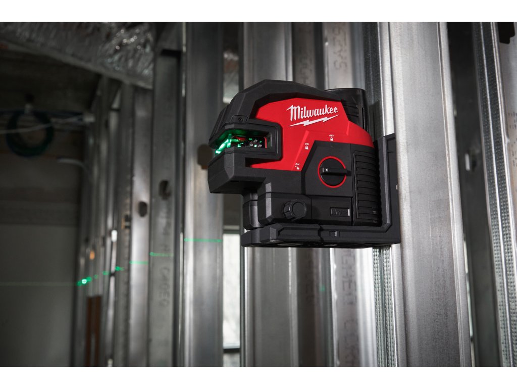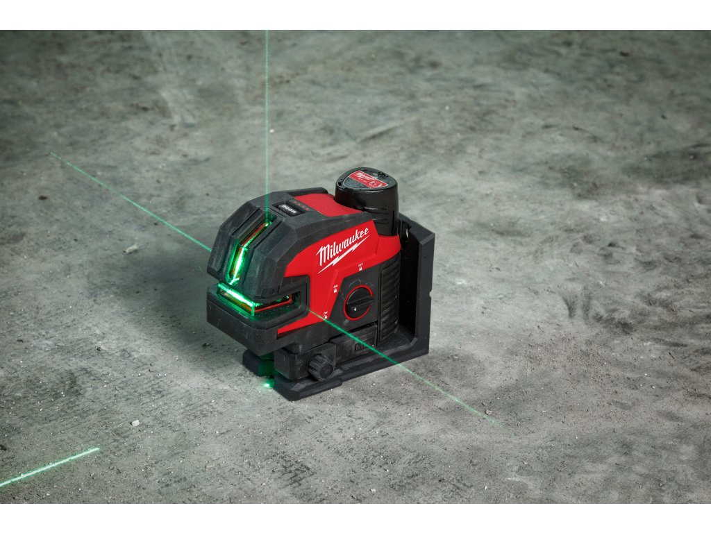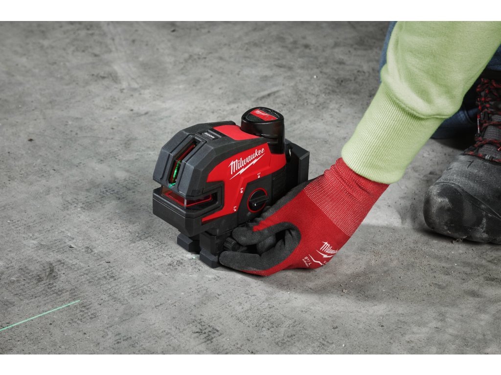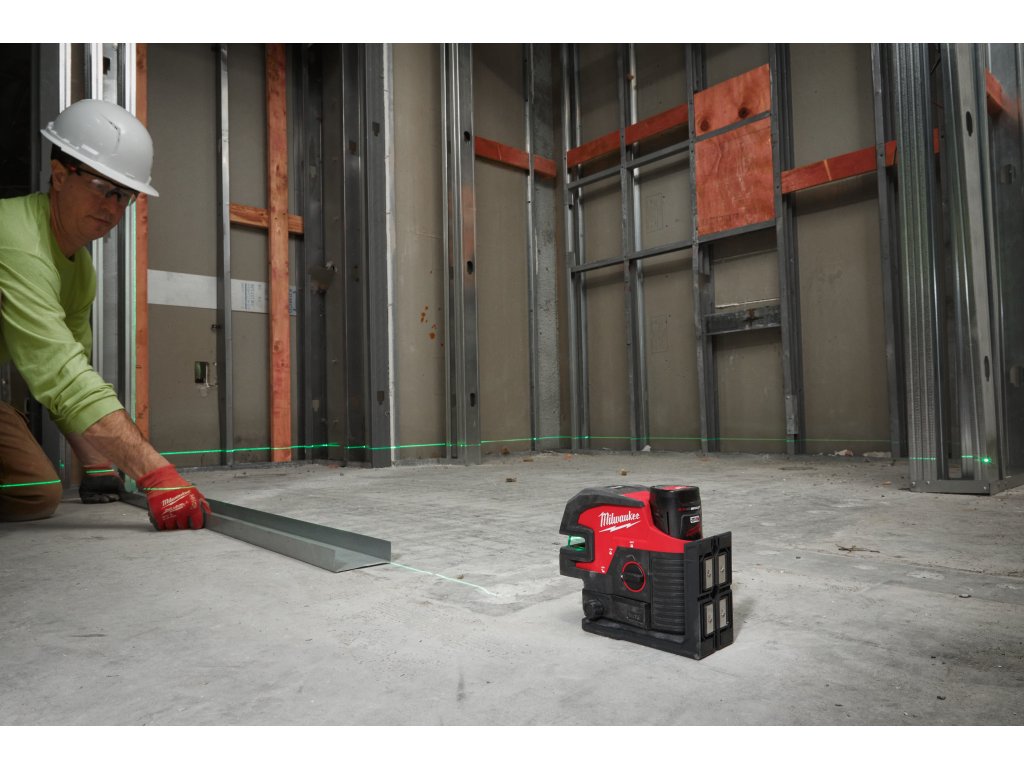 - Zelený křížový liniový laser M12™ se 4 body nabízí všechny funkce v jednom výrobku: horizontální srovnání, vertikální srovnání, přenos bodu z podlahy na strop a horizontální přenos bodu