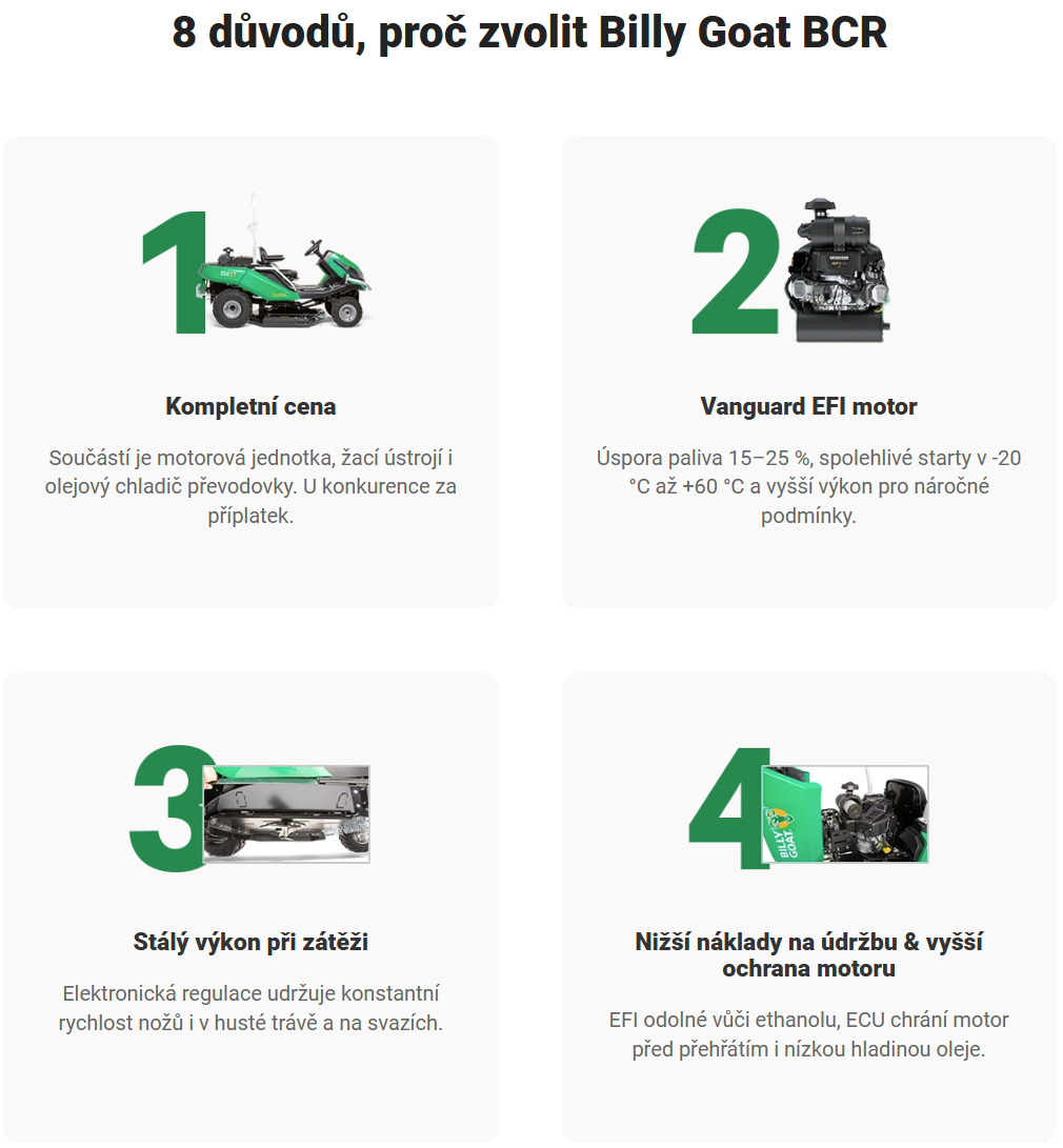 Ačkoliv značka Billy Goat pochází z USA, výrobou těchto mulčerů byla pověřena renomovaná česká společnost SECO. Díky tomu se můžete spolehnout nejen na precizní zpracování, ale i na výhody domácí výroby – rychlý servis, dostupné náhradní díly a technickou podporu přímo v České republice. Žádné zdlouhavé opravy nebo složitá logistika – vše máte po ruce.