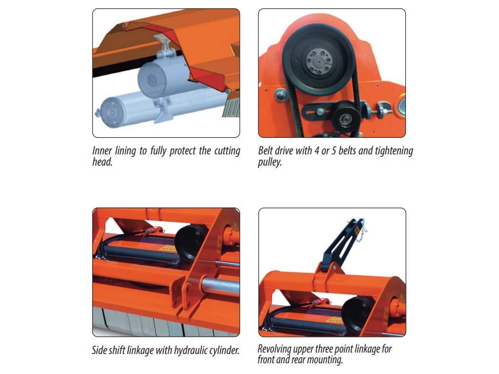Stroj je konstruován pro agregaci s traktory o výkonu 75–130 HP a je osazen zesíleným rotorem s dvojitou spirálou, který zajišťuje plynulý chod, vysoký výkon a rovnoměrné rozložení hmoty. Kovaná kladiva umožňují bez problémů mulčovat trávu i dřevité nálety do průměru Ø 4 cm. Důraz je kladen na dlouhou životnost, minimální vibrace a maximální kvalitu mulčování.