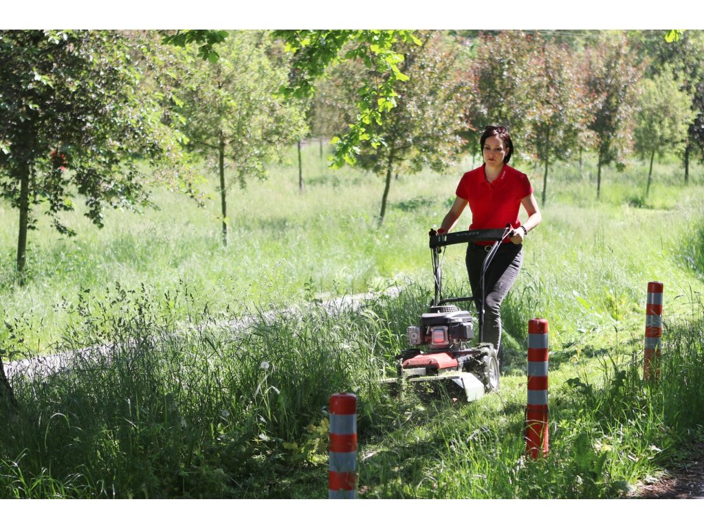 Záběr 58 cm umožňuje rychlé sečení větších ploch a ve spojení s pojezdem ve dvou rychlostech výrazně usnadňuje práci. Pevná náprava a nízké těžiště zajišťují stabilitu při práci na rovině i ve svahu. Kvalitní žárově zinkovaný kryt sekacího prostoru navíc zvyšuje odolnost proti korozi a mechanickému poškození.