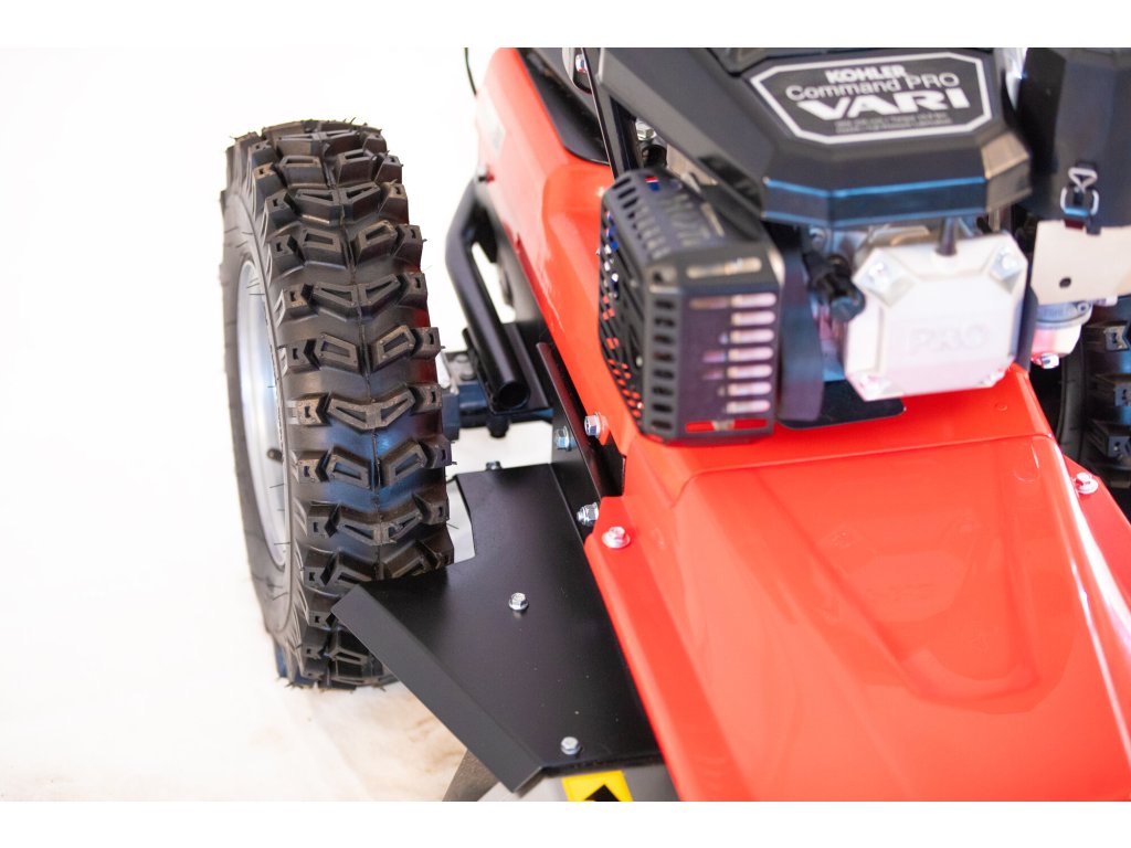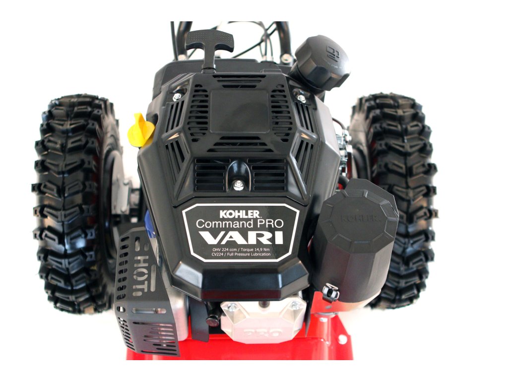 Srdcem stroje je profesionální čtyřtaktní motor KOHLER COMMAND PRO CV224 s litinovou vložkou válce a tlakovým mazáním, který poskytuje vysoký krouticí moment i při práci v náročných podmínkách. Mechanická převodovka GGT/VARI se 4 rychlostmi vpřed a zpátečkou je doplněna automatickou uzávěrkou diferenciálu, což výrazně zlepšuje trakci na svazích nebo při práci na kluzkém povrchu.