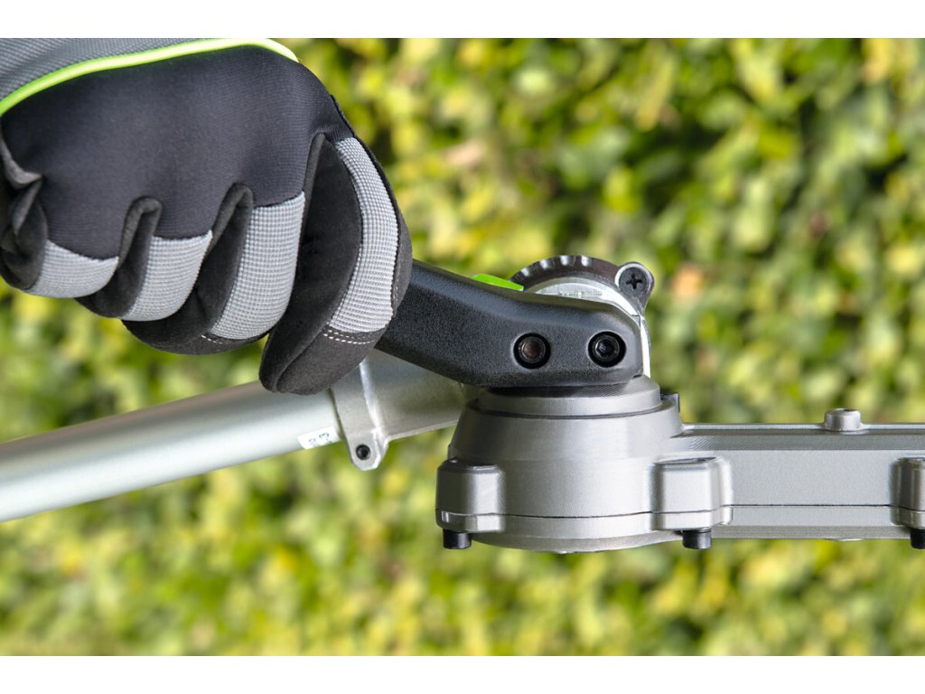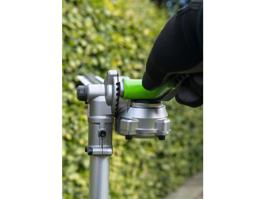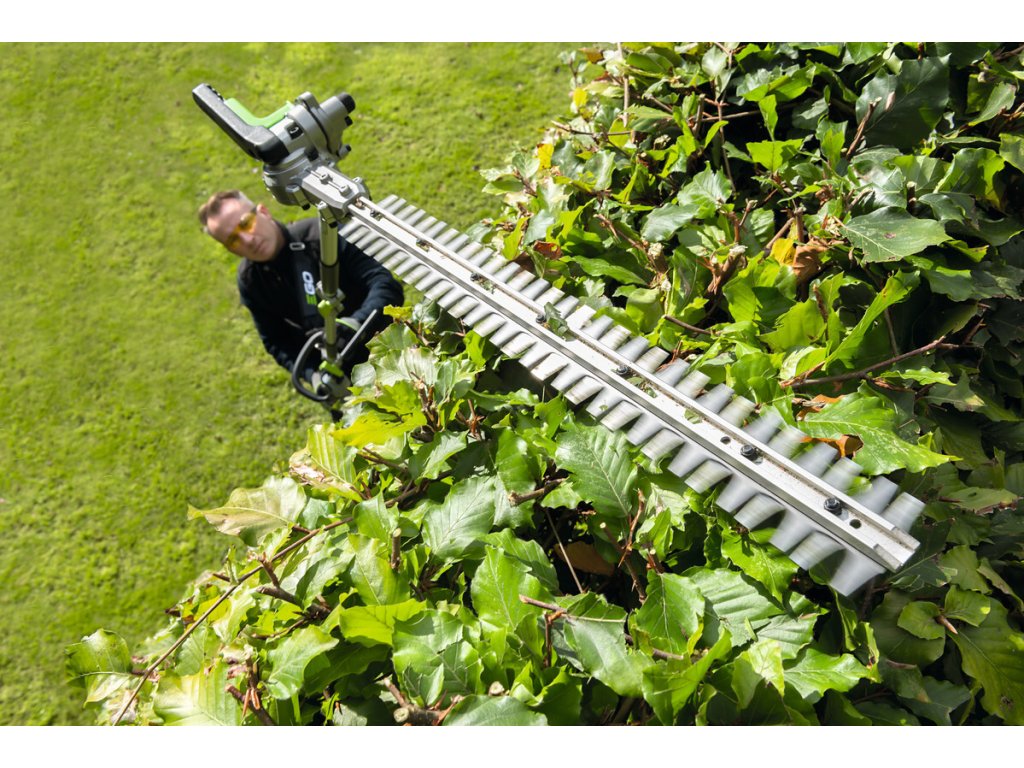 Pro kvalitní úpravu a precizní tvarování vysokých živých plotů a okrasných dřevin v okrasných zahradách, zámeckých parcích ale i doma na zahradě je důležitý čistý a přený střih, kterým rostlinu nepoškodíte, nezraníte a rostlina tak po zastřižení zůstává zdravá a svěží. To lze provádět v bezpečí stabilního postoje na pevné zemi. Proto je zde k dispozici nástavec s nůžkami na živý plot s dlouhým nástavcem a přesnou, 51cm dlouhou oboustrannou lištou, přesně broušenou pomocí diamantového nástroje. Pohodlné manipulaci při práci přispívá rovněž otočný kloub lišty. Úhel sklonu lišty do 12 různých poloh je velmi důležitý, aby se přizpůsobil příslušné práci na konkrétním porostu a usnadnil také uskladnění v malých prostorách. Mimořádně ostré střižné zuby mají rozteč 26mm jsou schopny ustřihnout dřevinu do průměru až 15 mm. Celková délka nástavce je 160cm, ve složeném stavu 99cm. Pohonná jednotka v kombinaci s tímto nástavcem je plnohodnotnými nůžkami na živé ploty s mimořádně velkým dosahem.