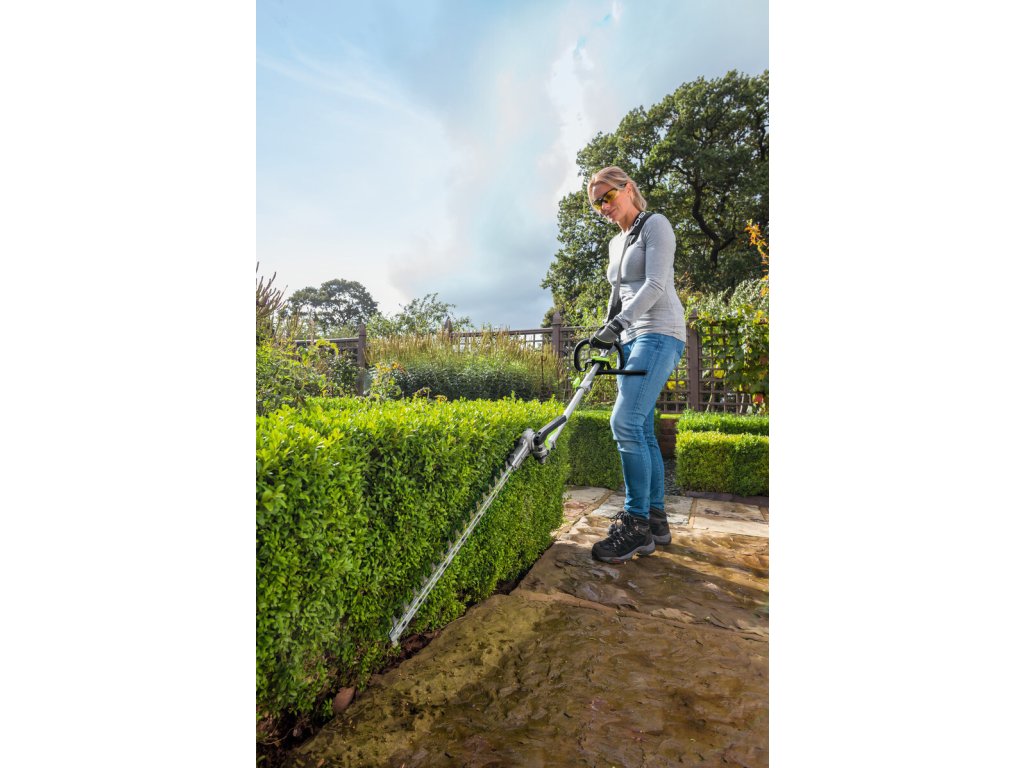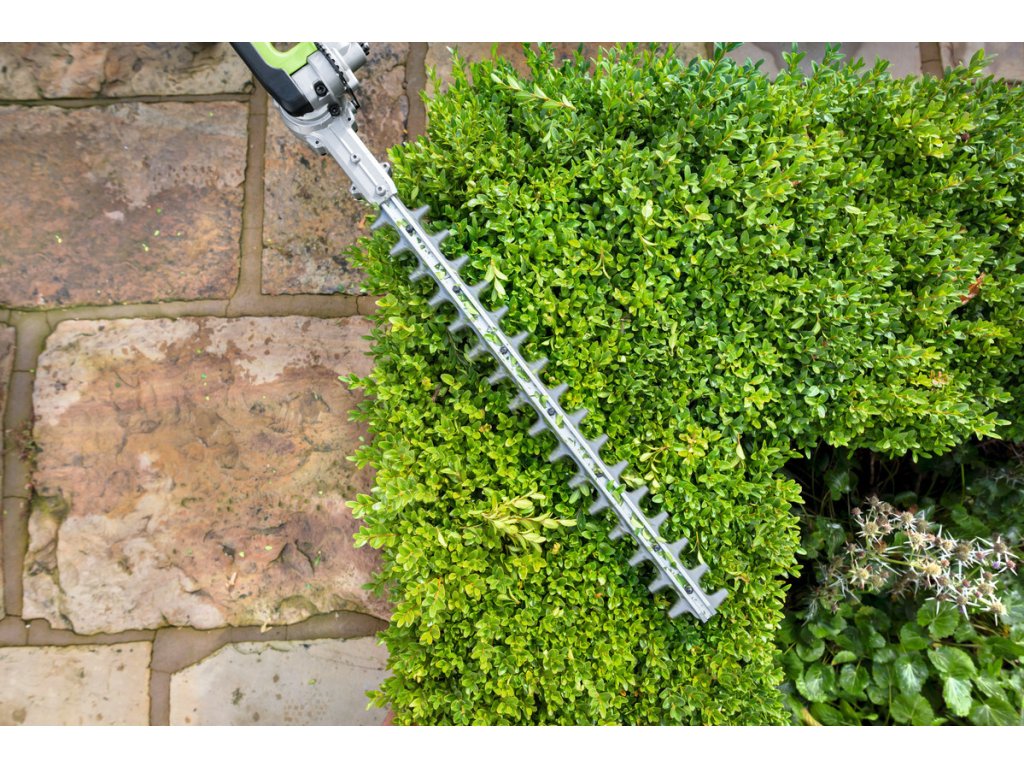 Pro kvalitní úpravu a precizní tvarování živých plotů a okrasných dřevin v okrasných zahradách, zámeckých parcích ale i doma na zahradě je důležitý čistý a přený střih, kterým rostlinu nepoškodíte, nezraníte a rostlina tak po zastřižení zůstává zdravá a svěží. Pro umělecké nebo figurální tvarování porostů je navíc důležitá kompaktnost, lehkost a snadná manipulace. Proto je zde k dispozici krátký nástavec s nůžkami na živý plot s 51cm dlouhou oboustrannou lištou, přesně broušenou pomocí diamantového nástroje. Pohodlné manipululaci při práci přispívá rovněž otočný kloub lišty. Úhel sklonu lišty do 9 různých poloh je velmi důležitý, aby se přizpůsobil příslušné práci na tvarování konkrétního porostu. Mimořádně ostré střižné zuby mají rozteč 26mm jsou schopny ustřihnout dřevinu do průměru až 15 mm. Celková délka nástavce je 120cm. Pohonná jednotka v kombinaci s tímto nástavcem je plnohodnotnými, mimořádně obratnými nůžkami na okrasné porosty a dřeviny.