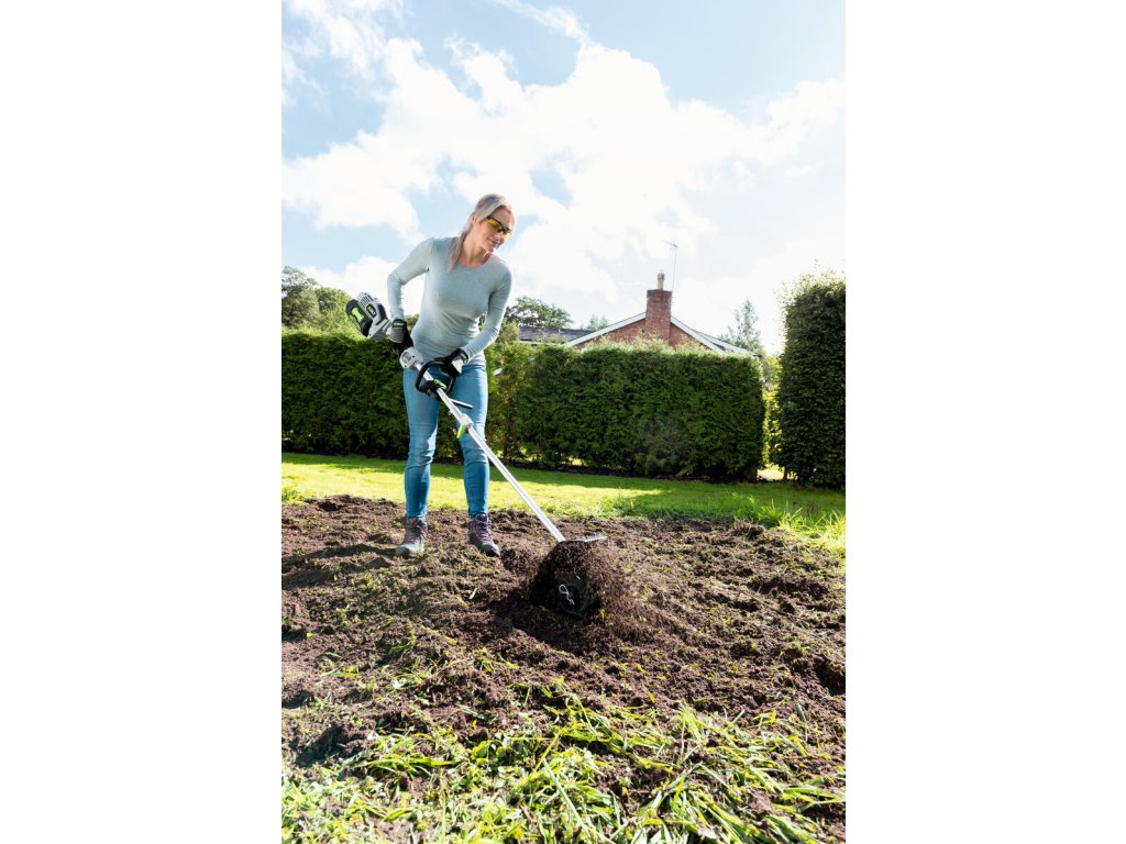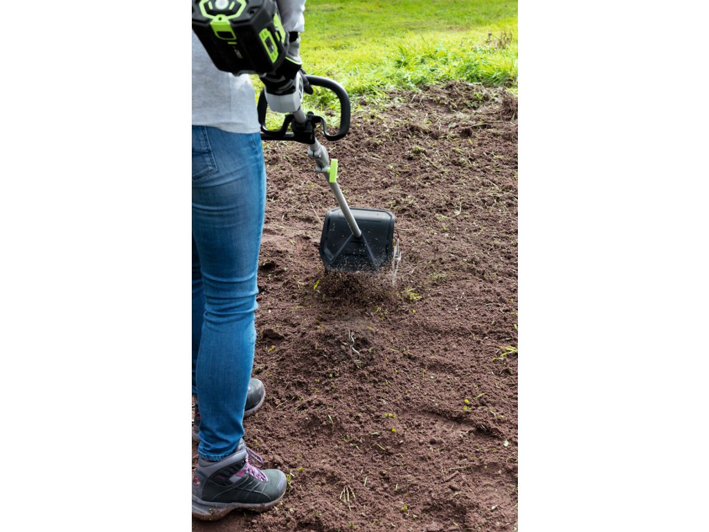 Pokud jste vlastníky malých záhonků pro pěstování zeleniny či okrasných květin, oceníte kompaktnost a přesnost nástavce s minirotavátorem pro kypření půdy na malých záhonech. Pevná převodovka hravě zvládá přenos síly od výkonného bezuhlíkového elektromotoru 56V, napájeného některou z nabídky spolehlivých baterií Ego Power+. Ve spojení s akumulátotovou pohonnou jednotkou se jedná o stroj vhodný pro použití také, kromě malých domácích záhonků, uvnitř uzavřených prostor, jako jsou skleníky či jiné pěstitelské objekty. Prostě nulové emise a hlučnost. Zavěšením celého stroje na jednostranný nosný popruh je práce s rotavátorem snadnou záležitostí.