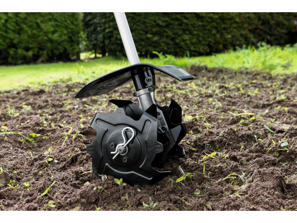 Nástavec s rotavátorem je kombinací hnací hřídele, odolné převodovky a rotavátorovými hvězdicemi pro okopávání a kypření malých květinových či zeleninových záhonků. Ve spojení s pohonnou jednotkou se jedná o velmi lehký a obratný minirotavátor, se kterým se velmi snadno citlivě manévruje v půdě mezi rostlinami aniž by došlo k jejich poškození. Svojí šíří 24cm je vhodný pro použití na malých květinových nebo zeleninových záhonech. Díky akumulátorovému napájení je vhodný pro použití i v uzavřených prostorech jako jsou skleníky a pod.