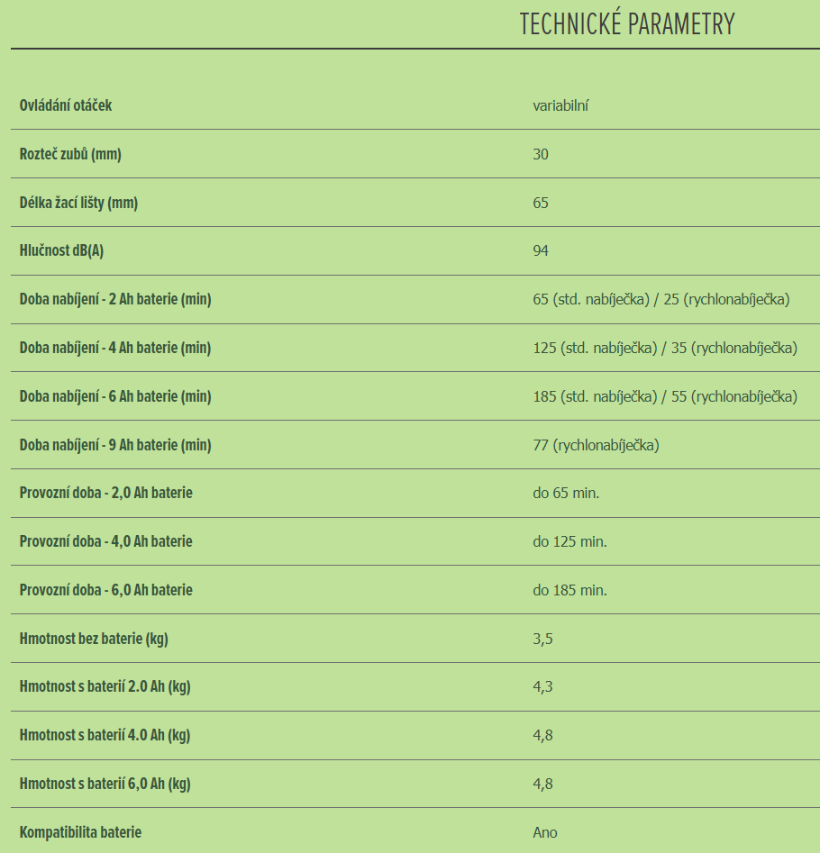 | Provozní doba - 2,0 Ah baterie: | do 65 min. |
