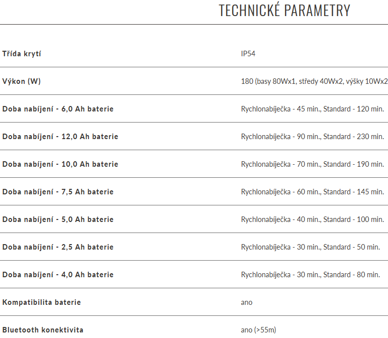 | Doba nabíjení - 6,0 Ah baterie: | Rychlonabíječka - 45 min., Standard - 120 min. |
