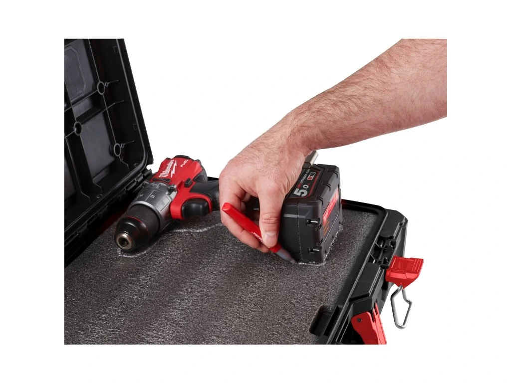 - Pěnová vložka vám umožní plně přizpůsobit vaše úložiště vyříznutím vlastních otvorů pro bezpečné uložení a ochranu vašeho nářadí.