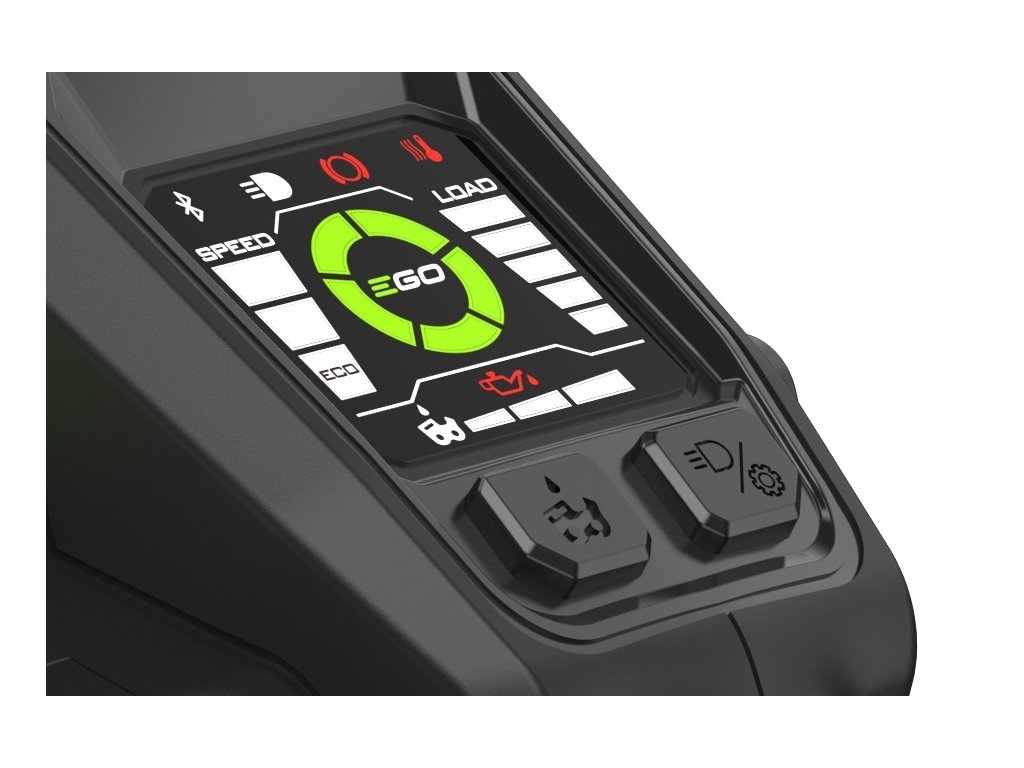 Přímo na rukojeti je umístěn dobře čitelný displej s indikátorem stavu nabití akumulátoru a množství oleje na mazání řetězu. Přes Bluetooth rozhraní je možnost připojení na dálku pomocí EGO Connect aplikace, což umožňuje uživateli nejenom sledovat výkon stroje ale také hlídat aktuální stav baterie tak, aby byla včas připravena k práci. Díky integrovanému LED světlu je velmi vhodná pro řezání za šera nebo v uzavřených prostorech se slabším osvětlením. Pila je dodávána samostatně a pro použití je nutné baterii a nabíječku dokoupit zvlášť nebo použít z jiného stroje značky EGO.