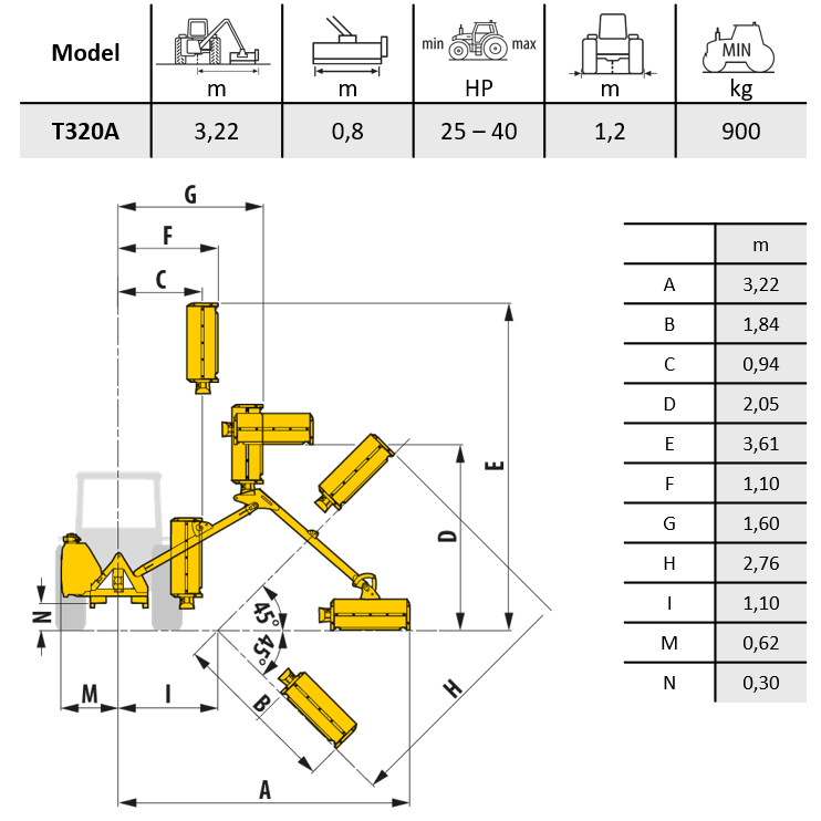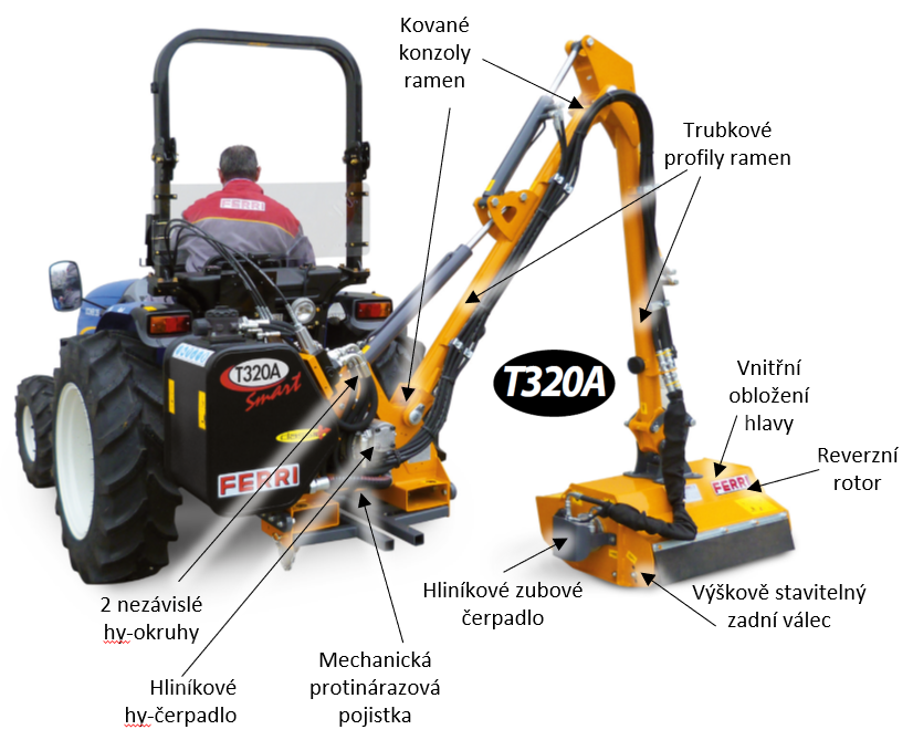 Příkopové rameno Ferri T320A je kompaktní a robustní řešení určené pro profesionální údržbu příkopů, svahů, mezí, okrajů komunikací a zeleně v těžko přístupných místech. Díky nízkým nárokům na výkon traktoru je ideální volbou pro menší zemědělské podniky, obce, technické služby i soukromé uživatele s traktory nižší hmotnostní kategorie.