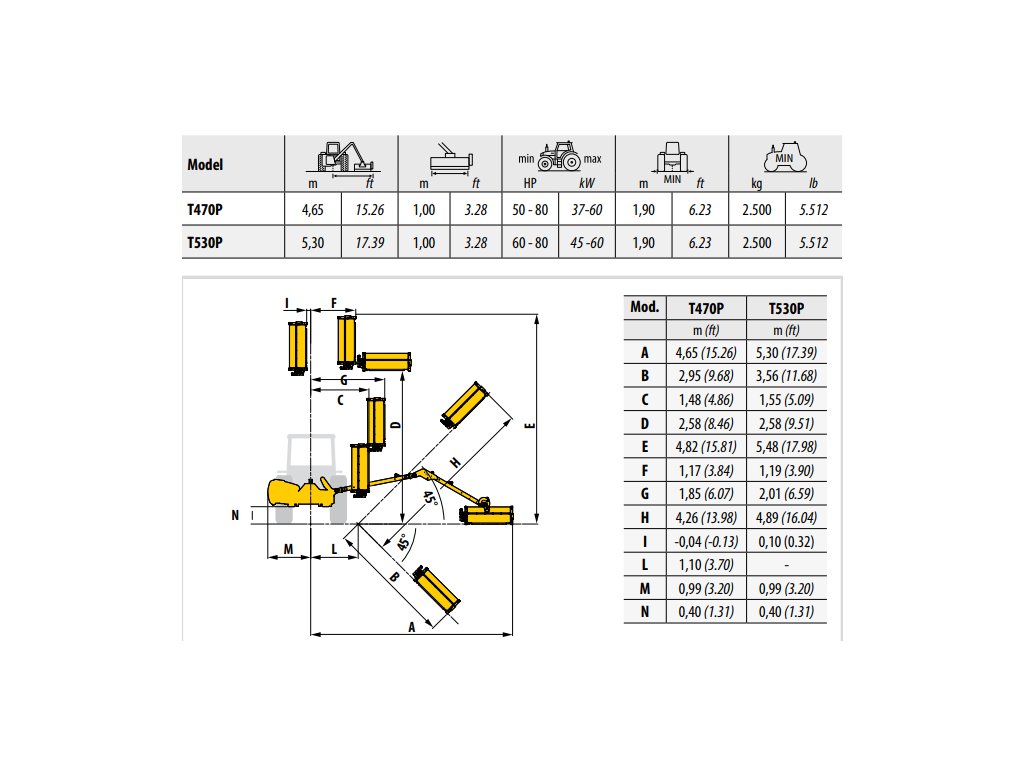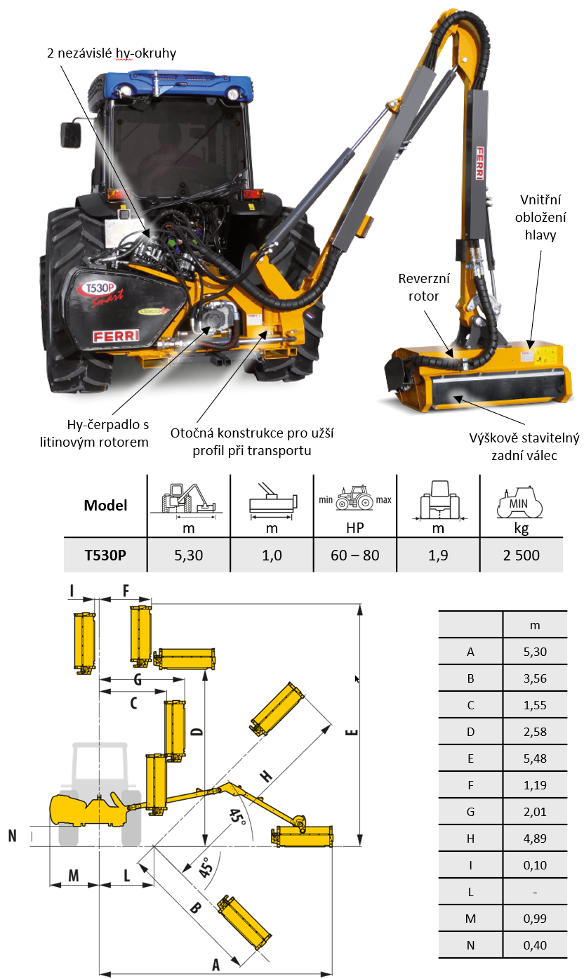 Model T530P je vybaven nezávislým hydraulickým systémem s čerpadlem s litinovým rotorem a mulčovací hlavou TID 100 s pracovními orgány uspořádanými do spirály, která zajišťuje plynulý chod, rovnoměrné zatížení rotoru a vysokou kvalitu mulčování. Rám Delta Box zajišťuje dokonalé vyvážení stroje, zatímco hydraulická protinárazová pojistka a odpružené první rameno výrazně zvyšují bezpečnost práce i komfort obsluhy při práci v terénu se sklonem až 45°.