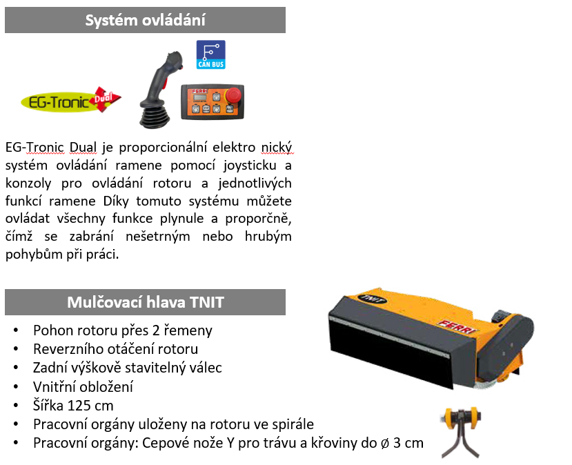 Příkopové rameno Ferri TP460 Vision představuje špičku v nabídce profesionálních příkopových ramen Ferri. Je určeno pro náročné komunální a zemědělské nasazení, kde je kladen maximální důraz na výkon, přesnost ovládání, bezpečnost a komfort obsluhy. Díky modernímu elektronickému řízení EG-Tronic, robustní konstrukci a výkonnému hydraulickému systému je ideální pro dlouhodobou práci v náročném terénu.