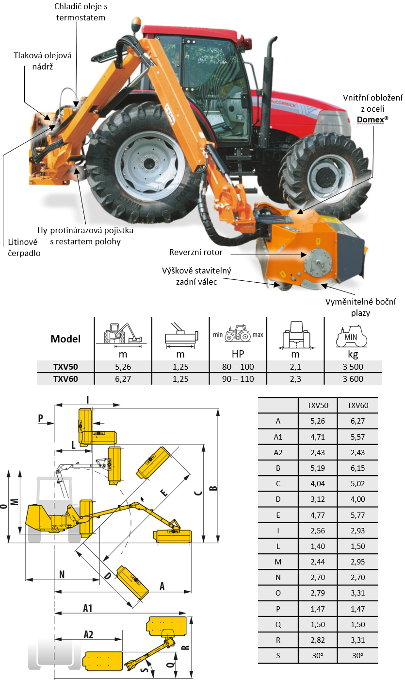 Model TXV50 Vision je vybaven výkonným hydraulickým systémem se šnekovou převodovkou, která zajišťuje vysoký krouticí moment i při práci s hustou a dřevnatou vegetací. Mulčovací hlava TNI 125 s pracovními orgány uspořádanými do spirály a zesílenými kladivy garantuje plynulý chod, vysoký výkon a dlouhou životnost. Díky uchycení na otočném čepu, systému plovoucí polohy hlavy a odpruženému prvnímu rameni LFA s dusíkovým akumulátorem je stroj stabilní a bezpečný i při práci ve svazích až do 45°.