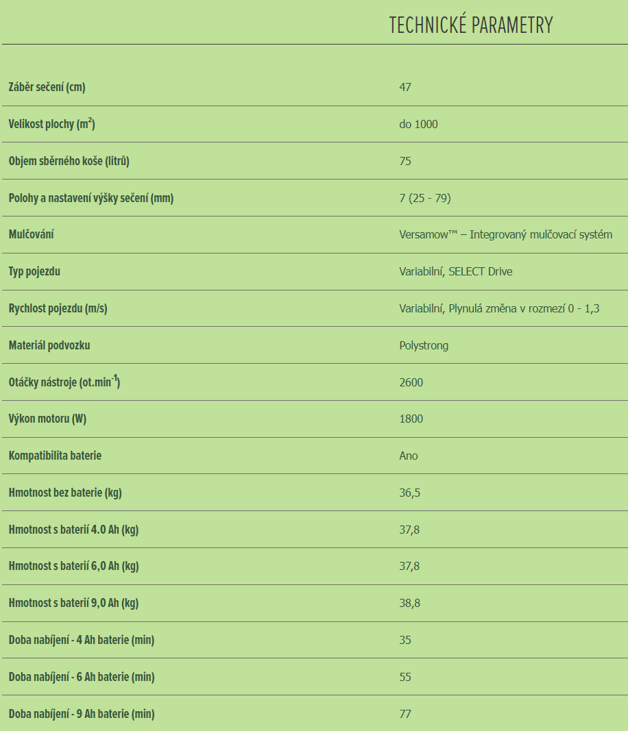 | Mulčování: | Versamow™ – Integrovaný mulčovací systém |