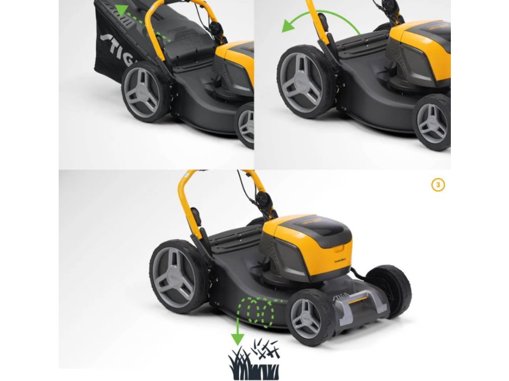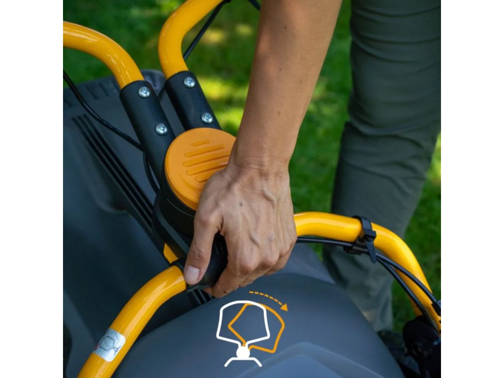 Velkou předností modelu je inovativní rukojeť Fulcrum, kterou lze jedním kliknutím otočit a složit – výrazně tak usnadňuje manipulaci, práci kolem překážek i skladování. Integrovaný hřeben proti skalpování trávníku napomáhá rovnoměrnému a šetrnému střihu i na nerovném povrchu.
