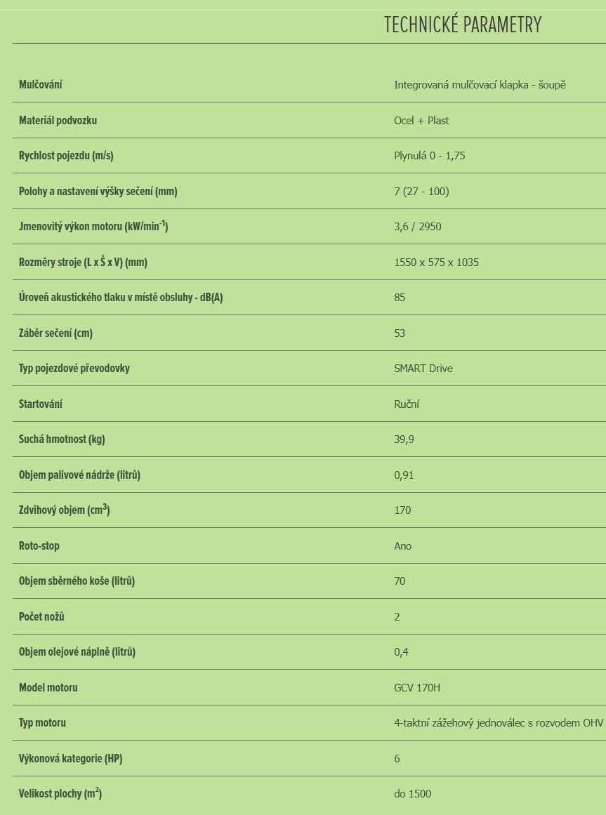 Vlastní pohon s možností plynulé změny rychlosti jízdy SMART Drive® se dočkal modernizace, zvýšení komfortu ovládání a dokonale se přizpůsobí pohybovým schopnostem každého. Snadné manipulaci přispívají nové nápravy a pojezdová převodovka, která působí menším odporem při jízdě bez použití pojezdu jak vpřed, tak i vzad. Výrazně se tak snižuje námaha při práci. Motor s automatickým sytičem je opatřen zařízením, které umožňuje velmi lehký start, který bez problémů zvládnou i ženy či fyzicky slabší uživatelé. Výkonem a hlavně kroutícím momentem je nový motor GCV 170 nejsilnějším motorem na trhu v dané kategorii a lehce překonává i konkurenční motory větších kubatur. Neméně důležitá je také odolnost motoru vůči automobilovým benzínům s obsahem 10% ethanolu (E10). Motor je navíc provozně čistější (plní normu EURO5), úspornější, snadnější na údržbu a odolnější vůči benzínům s obsahem biolihu.