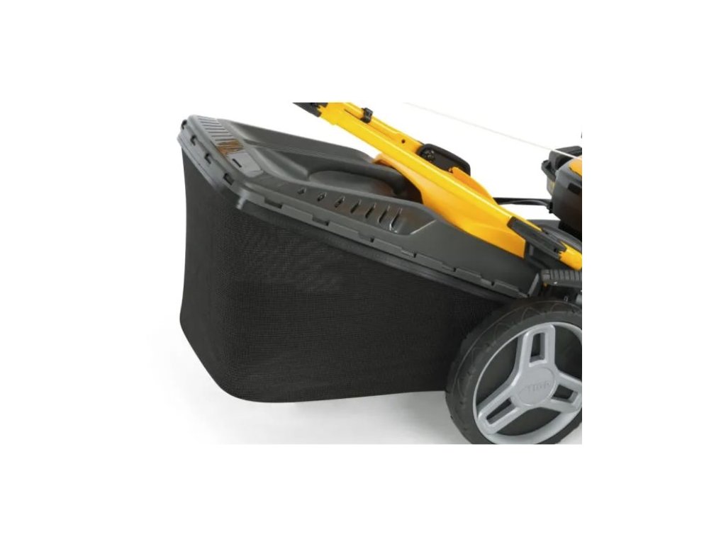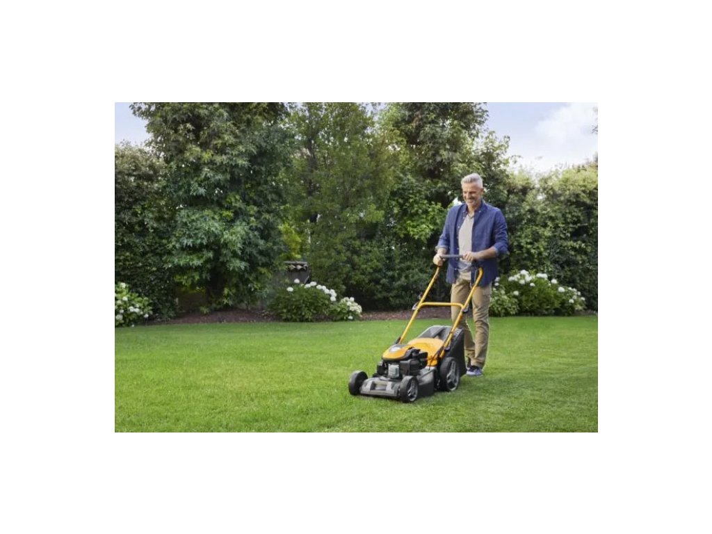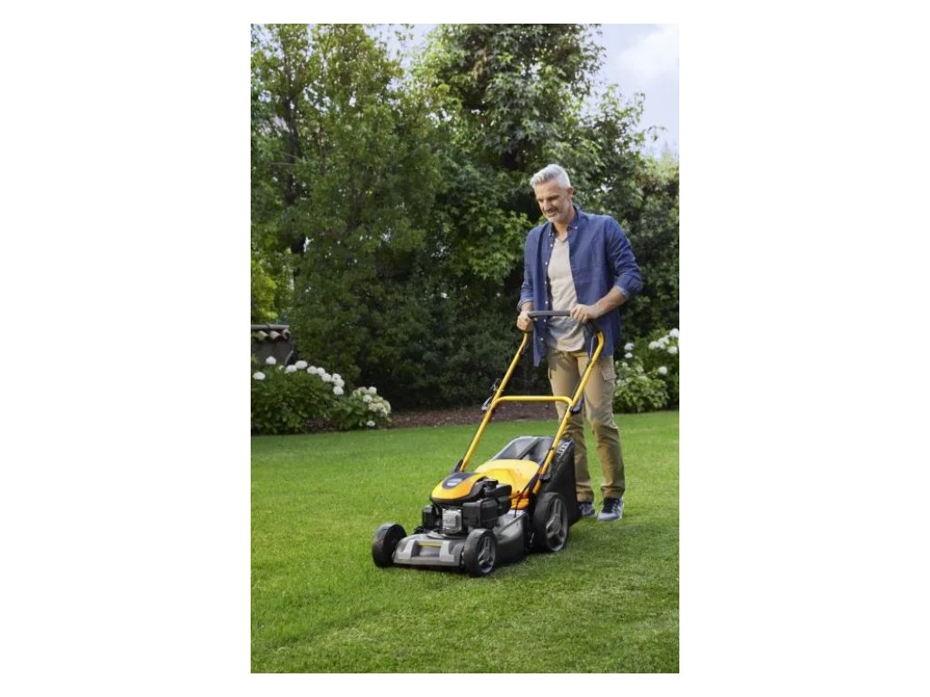 Díky centrálnímu nastavení výšky sečení můžete snadno upravit výšku střihu v šesti úrovních od 22 do 80 mm pomocí jediné páky. Velká zadní kola o průměru 280 mm zajišťují plynulý pohyb i na nerovném povrchu. Tráva je sbírána do 60 litrového hybridního koše s praktickým indikátorem naplnění.