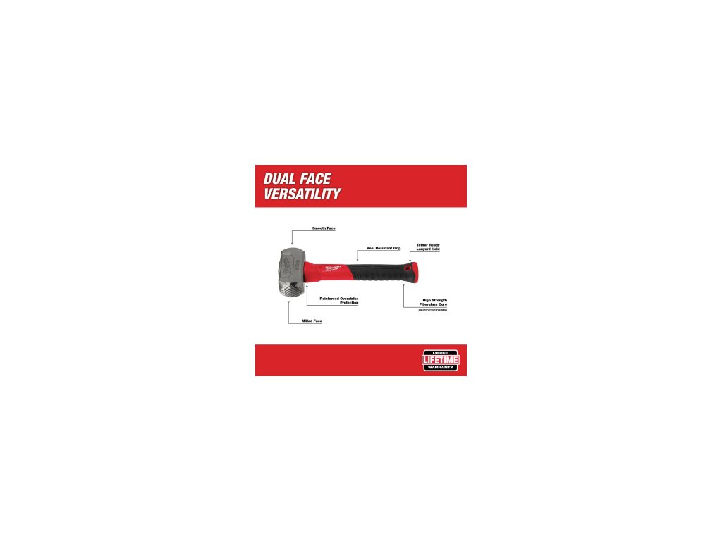 - Univerzálnost dvou čelních ploch: Frézovaná čelní plocha dodatečně zlepšuje úchop a minimalizuje nežádoucí pohyb při tlučení na sekáč nebo při zatloukání velkých hřebíků, hladká čelní plocha zabraňuje poškození materiálu.