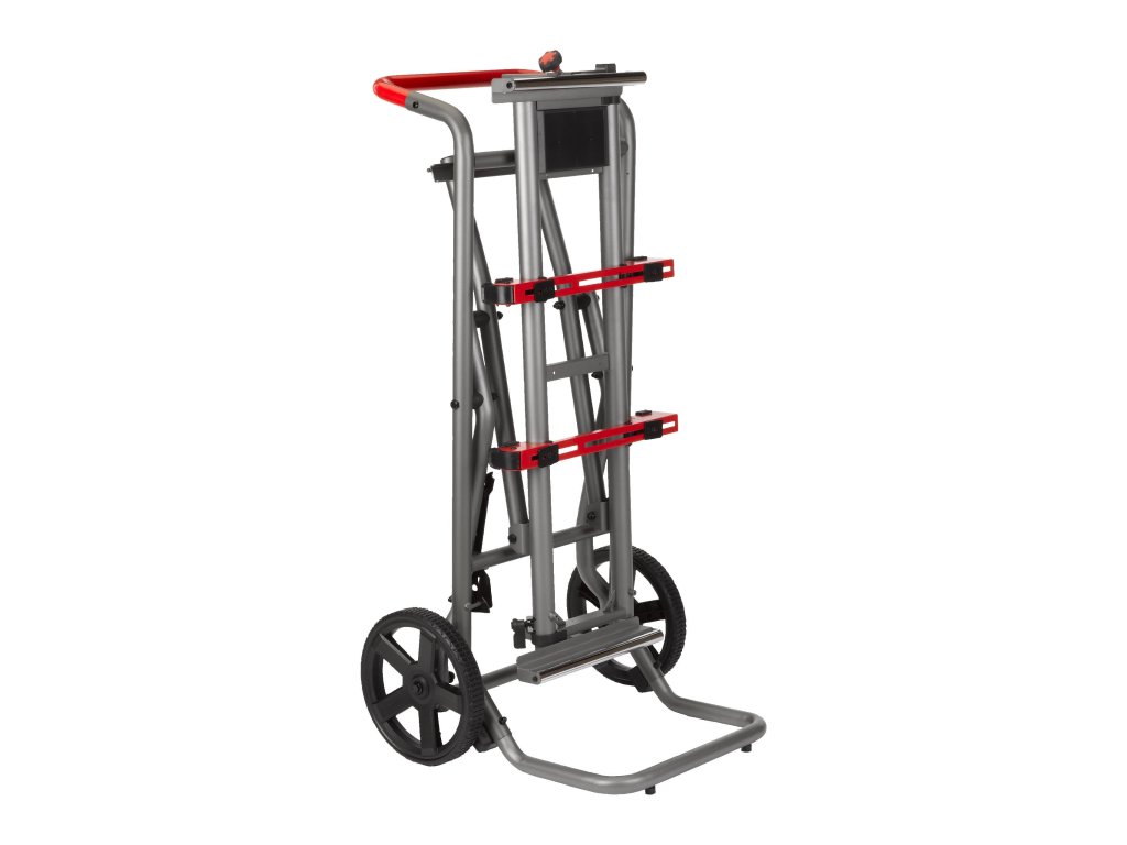 - Snadný jednočinný zámek nožního pedálu a jediný zvedací bod umožňují rychlé nastavení stojanu s připojenou pokosovou pilou