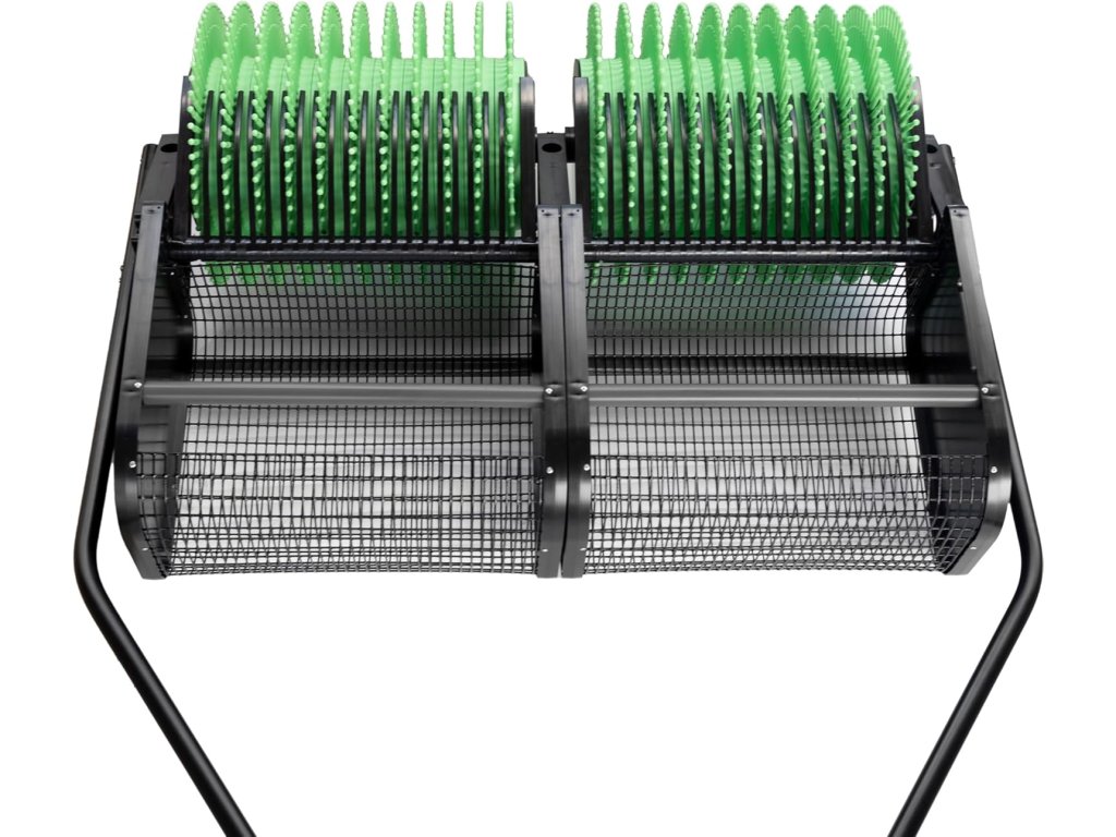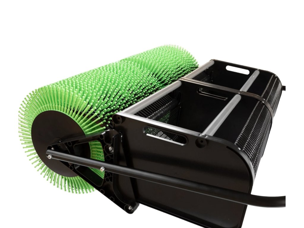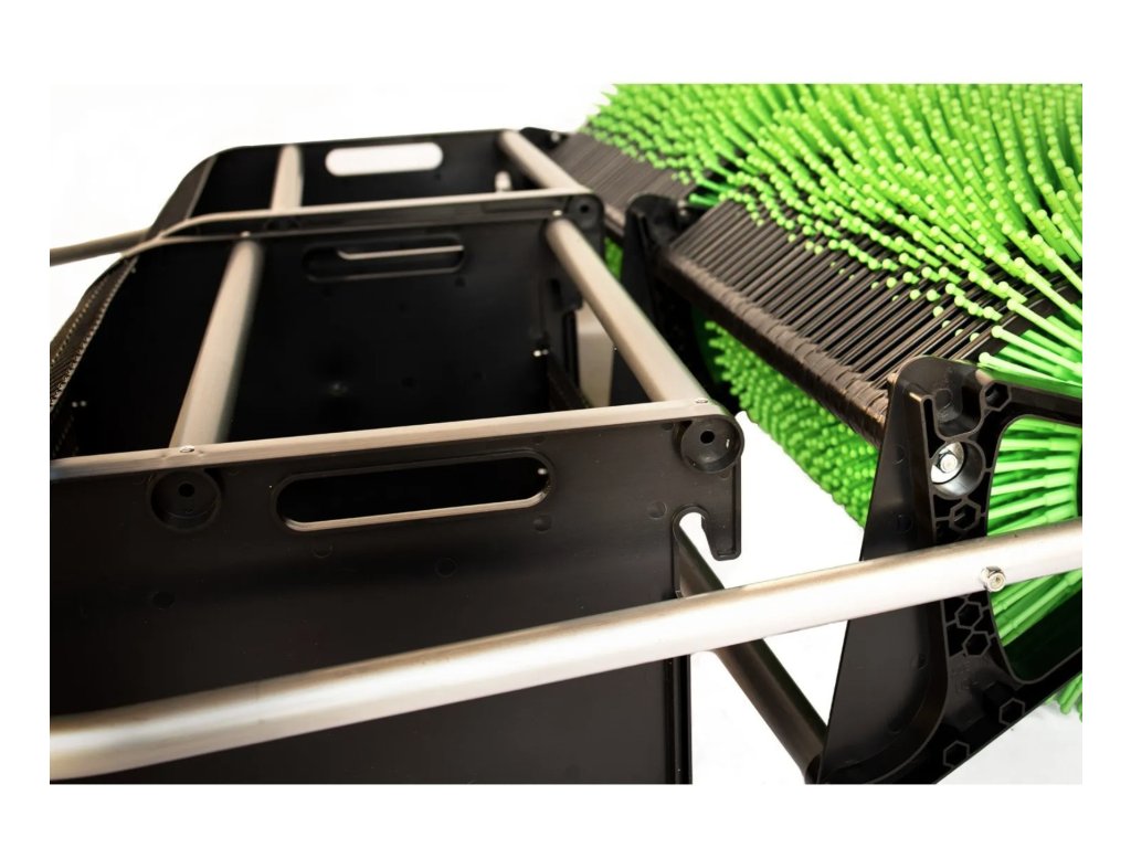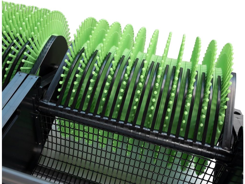 Model se záběrem 91 cm váží pouhých 18 kg, takže je lehký, skladný a snadno ovladatelný. Koš je pevný drátěný, ale doporučuje se plnit jej přibližně do poloviny – při sběru špuntů je pak manipulace mnohem pohodlnější.