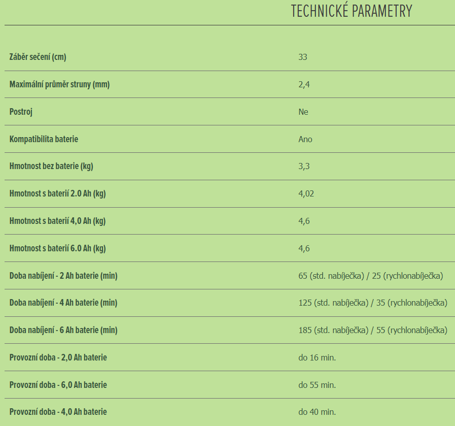 | Provozní doba - 2,0 Ah baterie: | do 16 min |