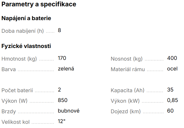 - Baterie: 48 V 35 Ah VRLA-GEL bezúdržbová