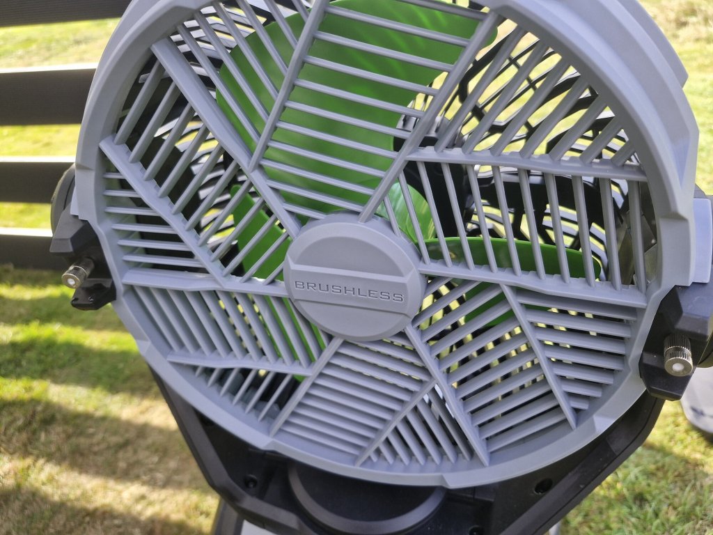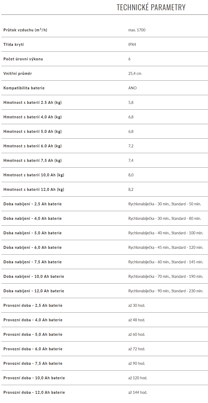Ventilátor má průměr 25 cm a vzhledem k jeho kompaktní velikosti a hmotnosti 4,6 kg je snadno přenosný. Lze si zvolit rychlost vzduchu z 5-ti možností plus funkce "turbo". Oběžné kolo vantilátoru je otočné ve 2 osách, tzn. jak horizontálně, tak i vertikálně v rozsahu 60°, 120°a 180°. Ve středu ventilátoru se nachází 2 vodní trysky, do kterých v případě nutnosti podává vodu integrované vodní čerpadlo. Vytváří se tak vodní mlhovina, jejíž intenzitu zle řídit kromě rychlosti ventilátoru i třema režimy výkonu vodního čerpadla. Vytvoříte si tak optimální prostředí. Maximální průtok vzduchu ventilátorem je 1.700 m3/hod. při max. rychlosti vzduchu 9 m/s. Jen pro představu, velikost horkovzdušného balónu pro pilota se 4 pasažéry je cca 3.000 m3. To znamená, že tímto ventilátorem byste takový horkovzdušný balón naplnili za necelé 2 hodiny. Slušný výkon na takového drobečka, že? A jak dlouho vydrží baterie? V sadě dodávanou baterií EGO 2,5Ah vydží ventilátor v režimu 1 běžet až 30 hodin nepřetržitě.