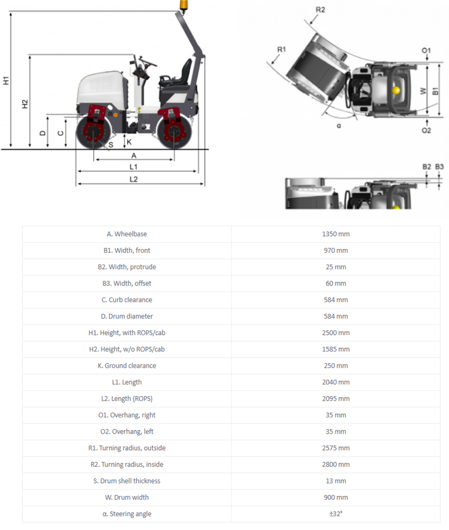 Dynapac CC900S Plus je kompaktní tandemový vibrační válec určený především pro hutnění asfaltu na chodnících, cyklostezkách, malých komunikacích a parkovištích. Díky provozní hmotnosti 1640 kg, pracovní šířce válce 900 mm a rovnoměrnému rozložení zatížení (SLL: 8,8 / 9,5 kg/cm) dosahuje vynikajících výsledků na malých a středně velkých plochách. Maximální stoupavost činí 50 %, přičemž stroj je vybaven motorem Kubota o výkonu 18 kW (24 hp) při 2800 ot/min, který splňuje emisní normu Stage IV/Tier 4f a přináší nižší spotřebu paliva.