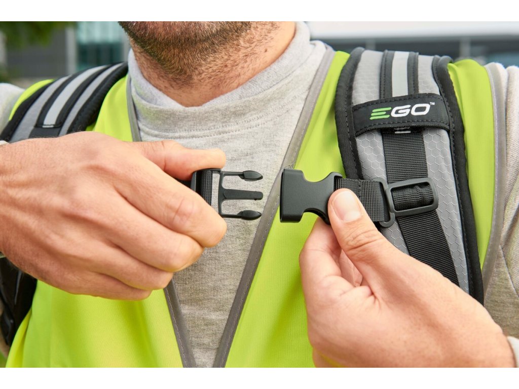 Je všeobecně známo, že čím větší baterie, tím větší výkon, delší pracovní doba, ale bohužel i větší hmotnost baterie. Na druhou stranu zase čím lehčí je stroj, tím komfortnější a snadnější je jeho obsluha. Např. baterie s kapacitou 10,0Ah váží 3,4kg a profesionální zádové velkokapacitní baterie 7,8kg, resp. 9,0kg. To je hmotnost, kterou již nelze dlouhodobě nosit v rukou. Proto existuje pohodlnější způsob maximálního využití energie i těchto největších baterií EGO Power+pomocí ergonomického profesionálního nosného zádového nosiče baterií a komfortního ergonomického postroje. Postroj je opatřen bohatým polstrováním ramenních popruhů i bederního pásu a možností nastavení popruhů optimálně pro konkrétní postavu uživatele. Pro případ možnosti zavěšení křovinořezu je nutné dokoupit závěs pro křovinořezy AHP1500.