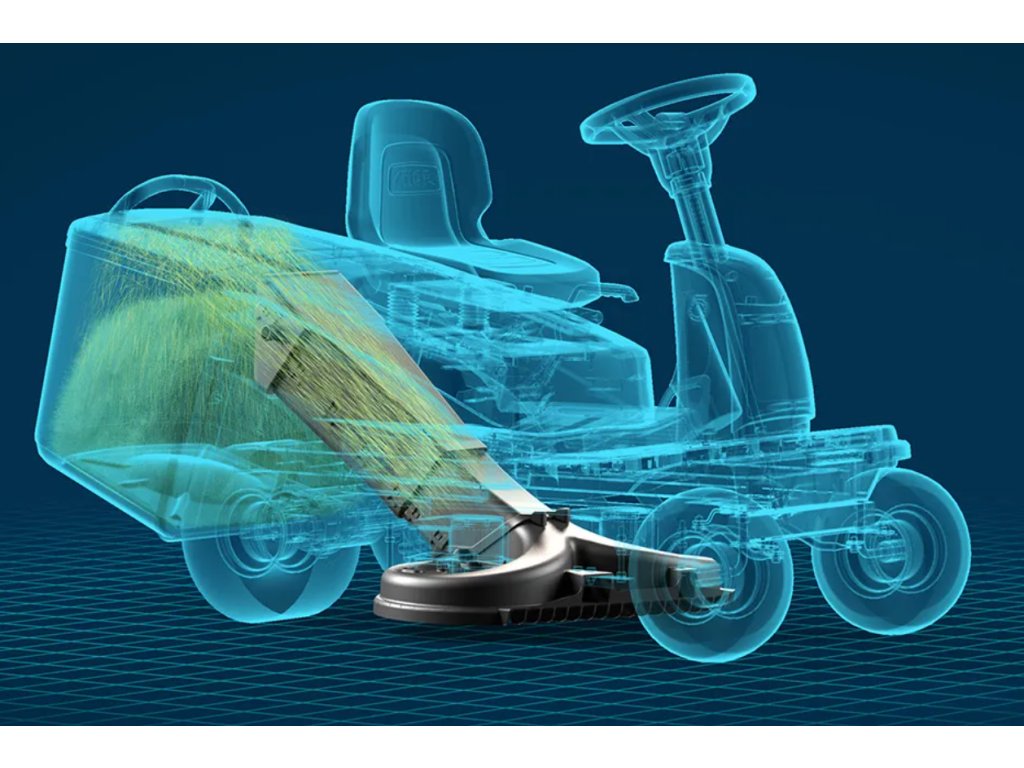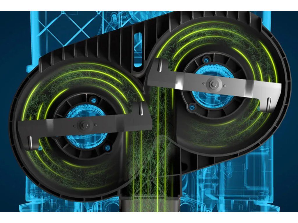 Nové žací ústrojí se dvěma protiběžnými noži a aerodynamickým sběrným tunelem zajišťuje precizní střih, efektivní sběr trávy a vyšší energetickou účinnost. Tráva je vedena skrytým tunelem přímo do sběrného koše, což zlepšuje výkon sběru a snižuje hlučnost.