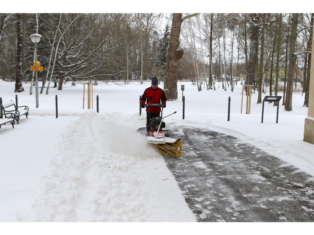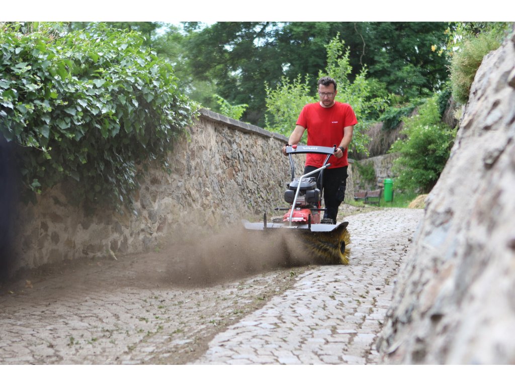 Ergonomická řídítka jsou výškově nastavitelná a vybavená komfortními gripy, které tlumí vibrace při práci. Zametací kartáč lze také doplnit praktickým příslušenstvím, například sběracím boxem, antiprachovou plentou nebo odhrnovací radlicí, což z něj dělá univerzální stroj pro údržbu areálů během celého roku.
